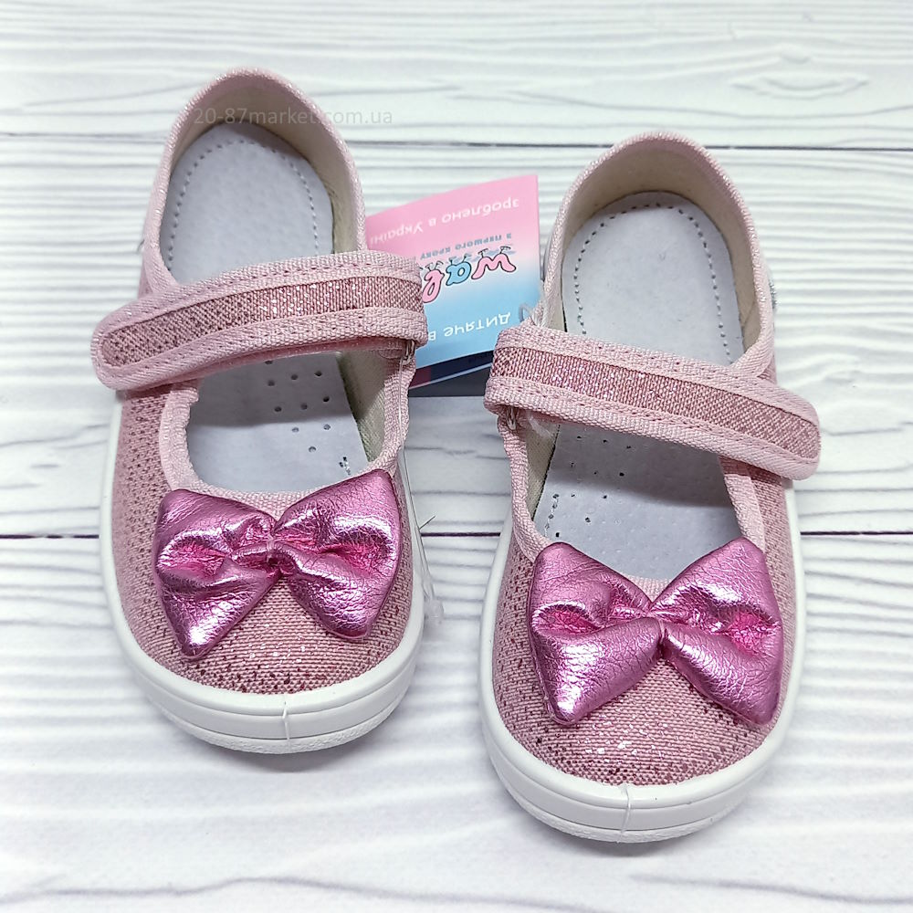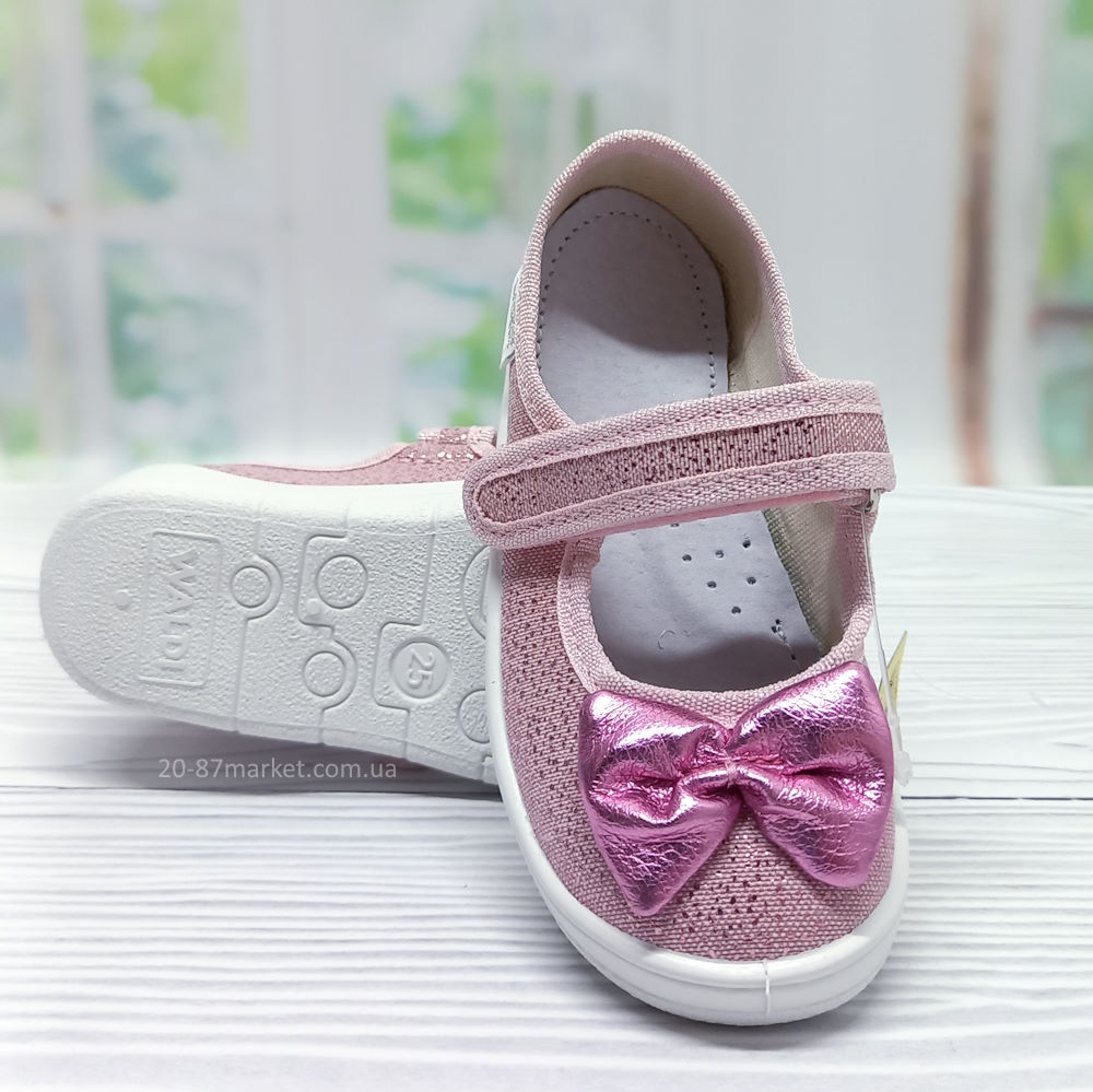 Розовые детские тапочки Валди, застёжки на качественных липучках, для девочки, украшение: "Бант". Кожаная стелька, супинатор, твёрдый задник, гибкая подошва белого цвета.