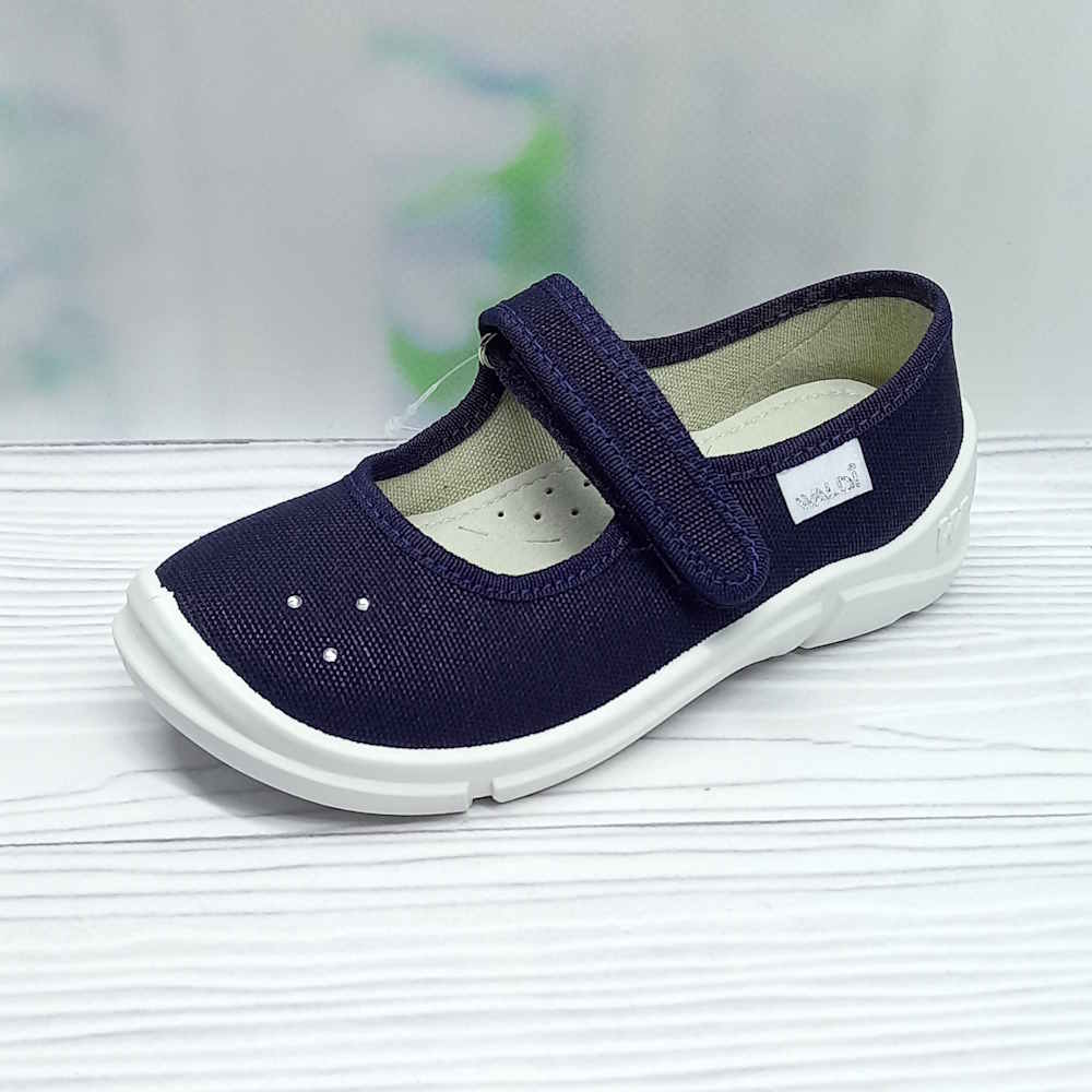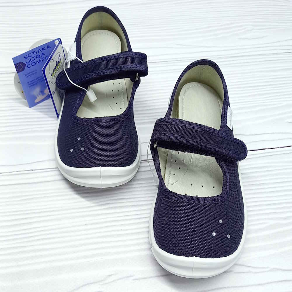 Синие тапочки со стразиками выглядят нарядно и практично. Удобные застёжки на липучках помогают быстро обувать и снимать обувь. Кожаная стелька с супинатором, твёрдый задник, гибкая белая подошва обеспечивает лёгкость и комфорт при каждом шаге. Идеальны для дома и садика.
