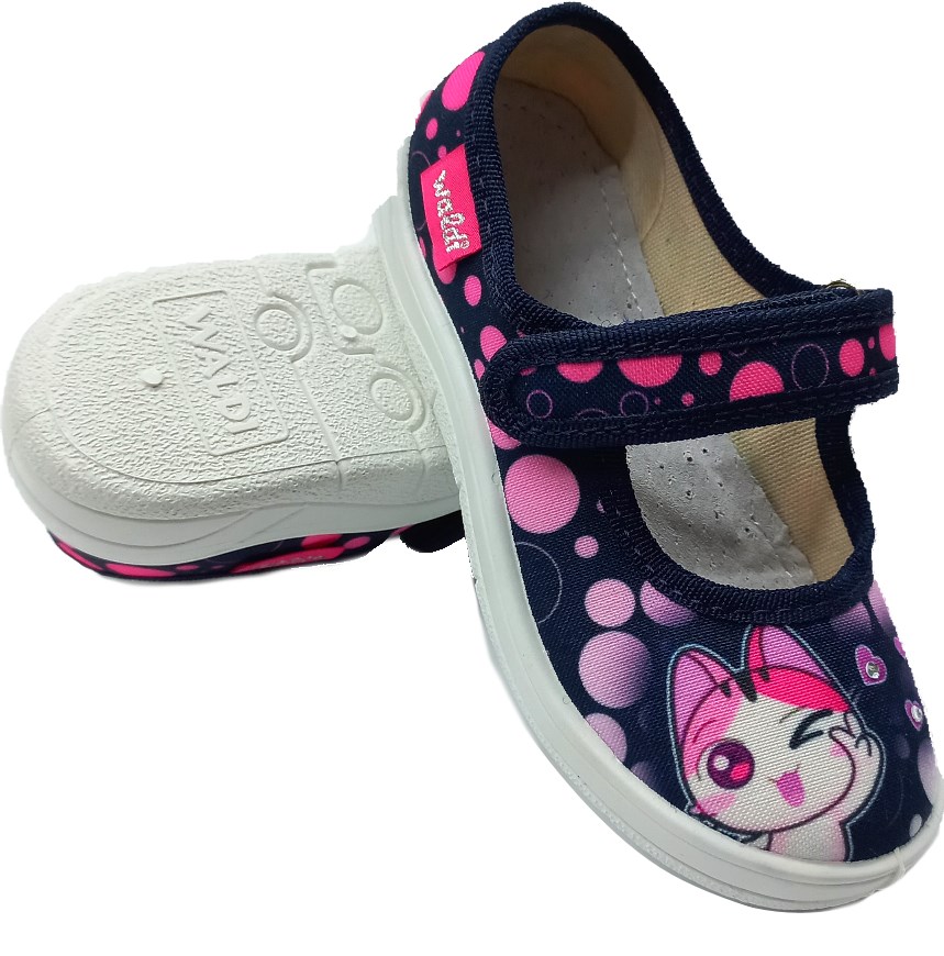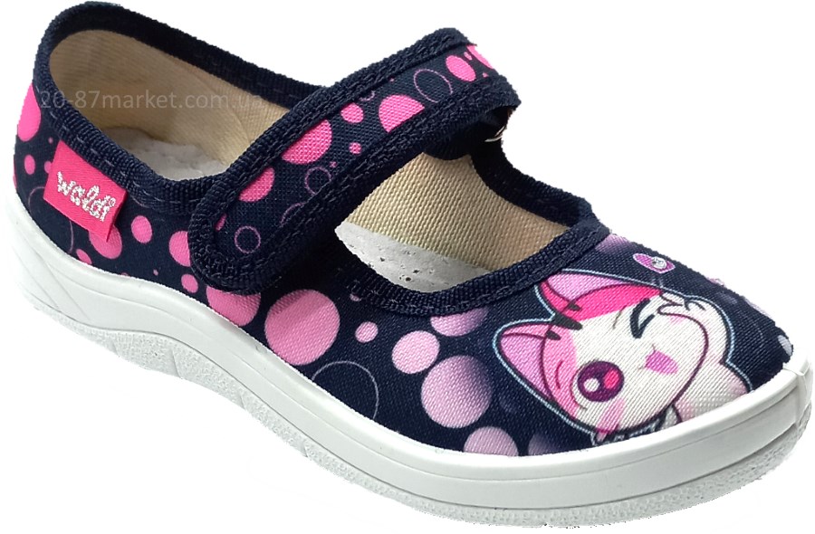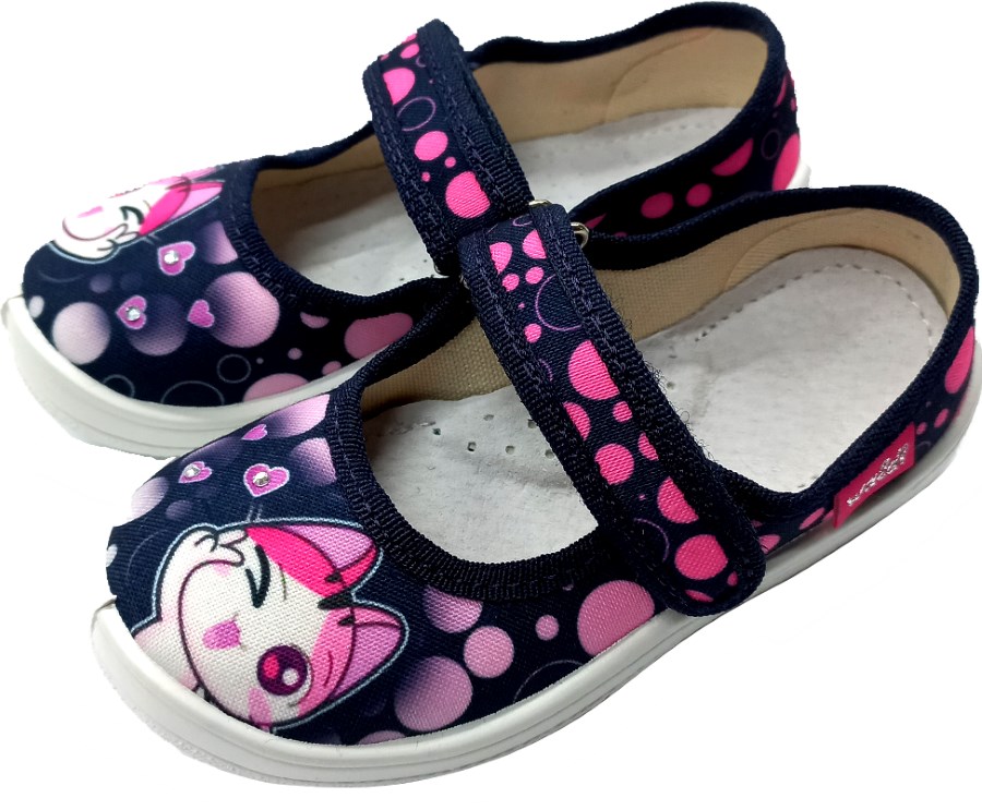 Тапочки синего цвета на липучках для девочки, принт "Кошка", стразик. Кожаная стелька, супинатор. Подошва белого цвета.