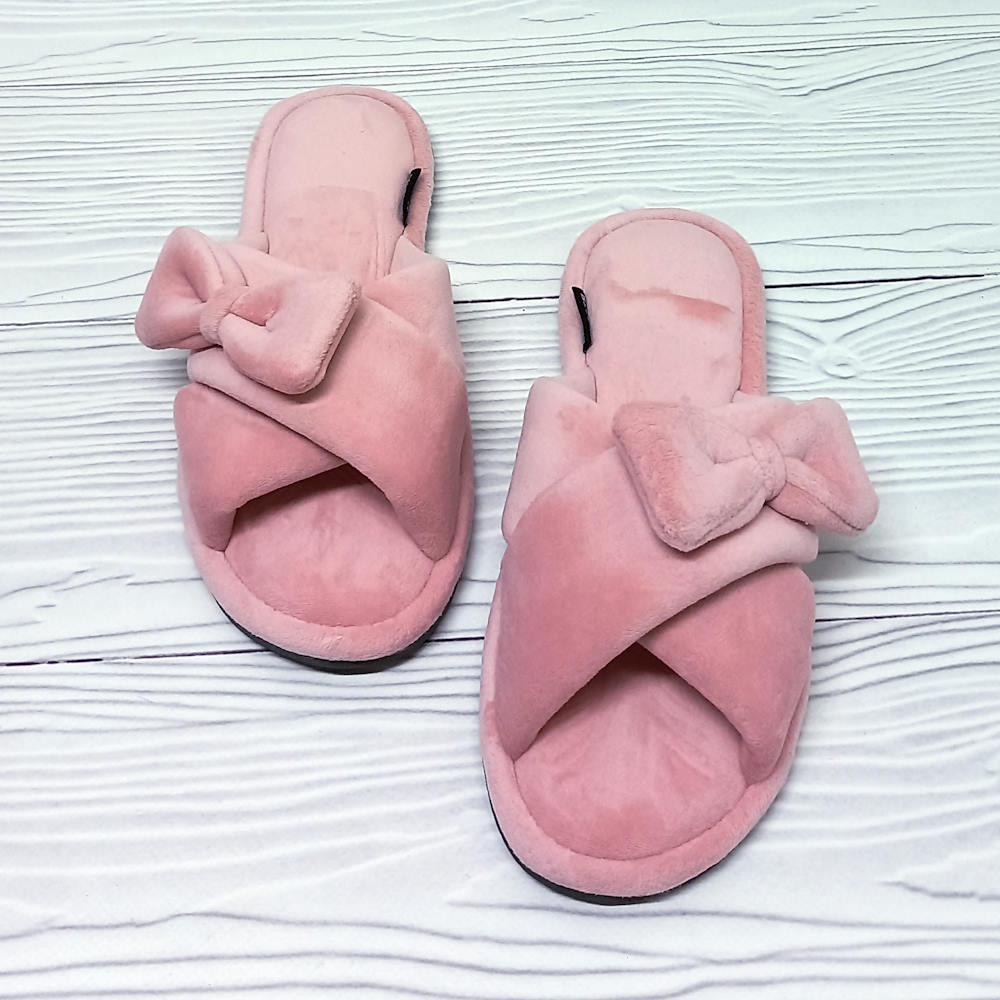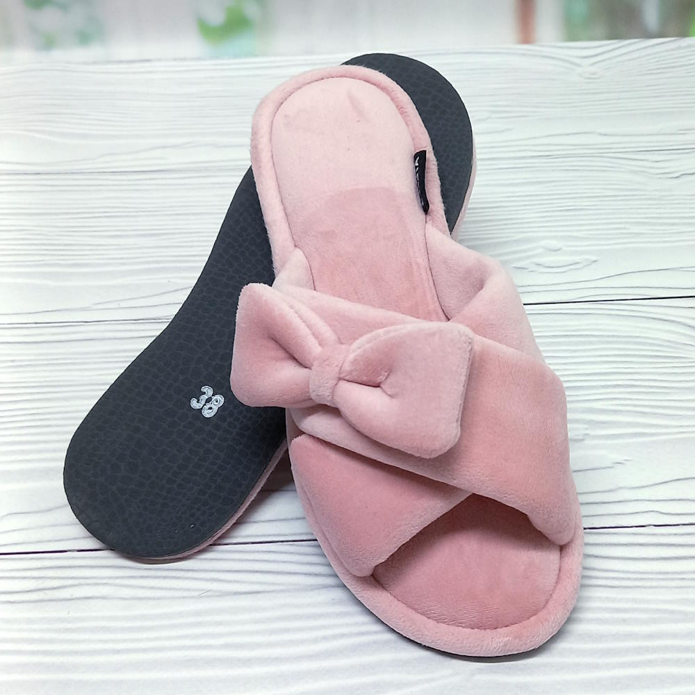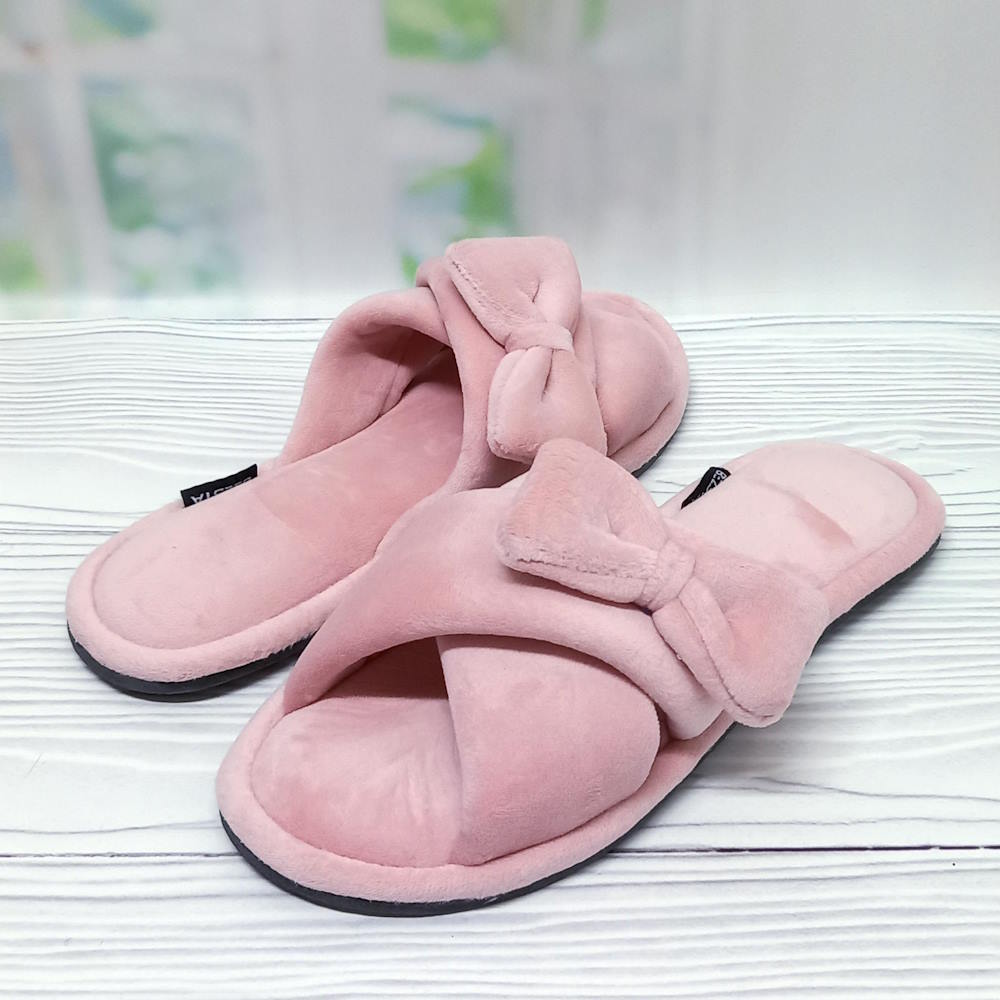 Женские велюровые тапочки тм Белста, украшены элегантным бантиком. Открытый перед тапочек улучшает вентиляцию стопы. Подошва лёгкая, из вспененной резины, велюровая стелька.