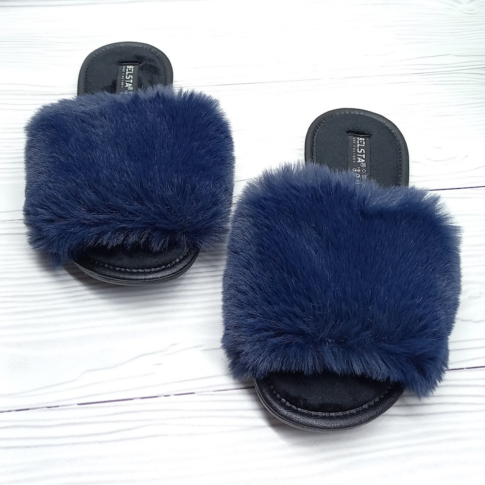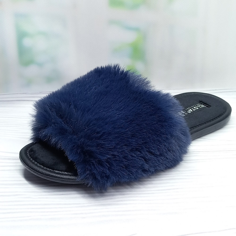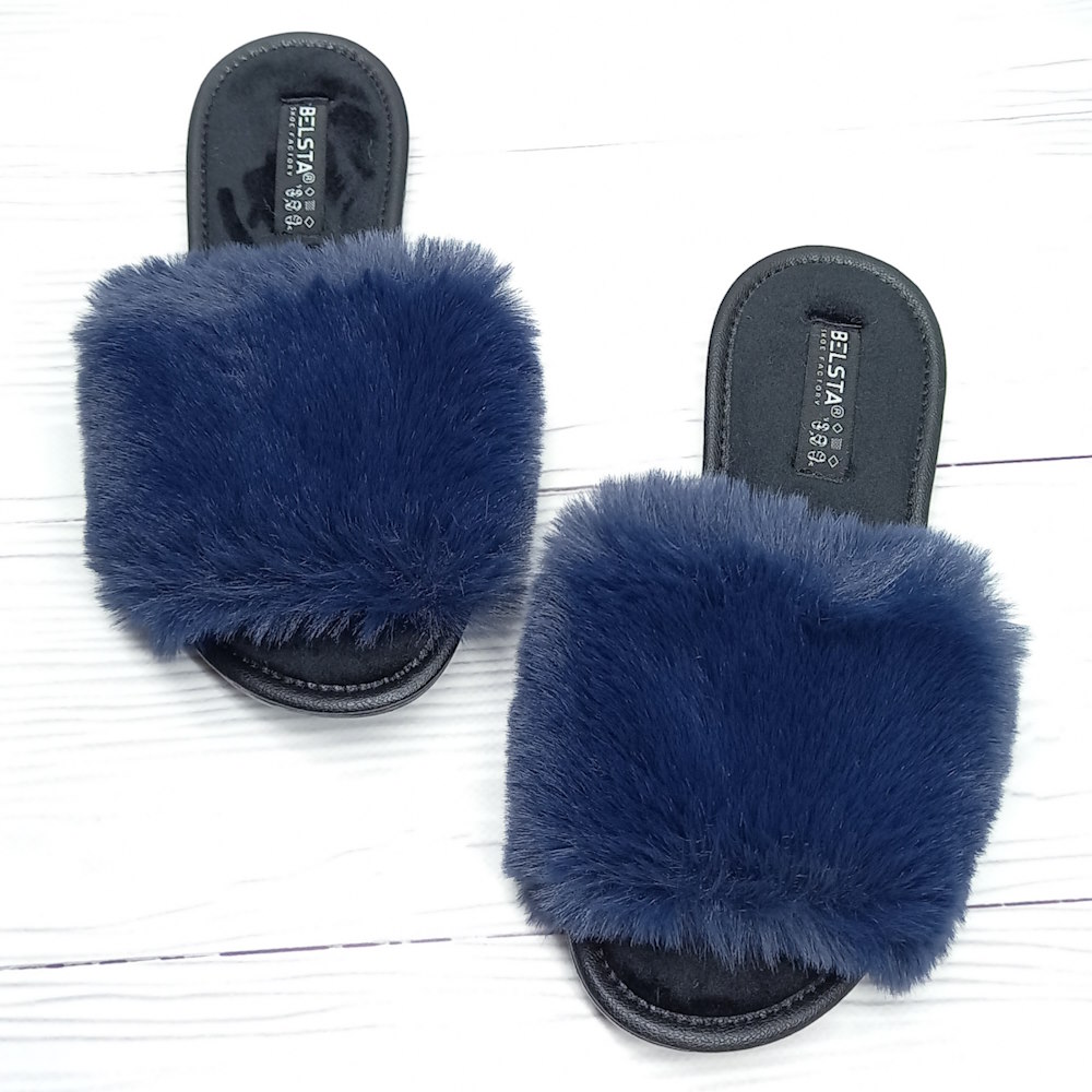 Глубокий синий цвет придаёт аккуратный и современный вид. Верх из искусственного меха мягкий и приятный на ощупь, создаёт ощущение тепла и уюта. Открытый носок и открытая пятка делают модель лёгкой и удобной для быстрого обувания.