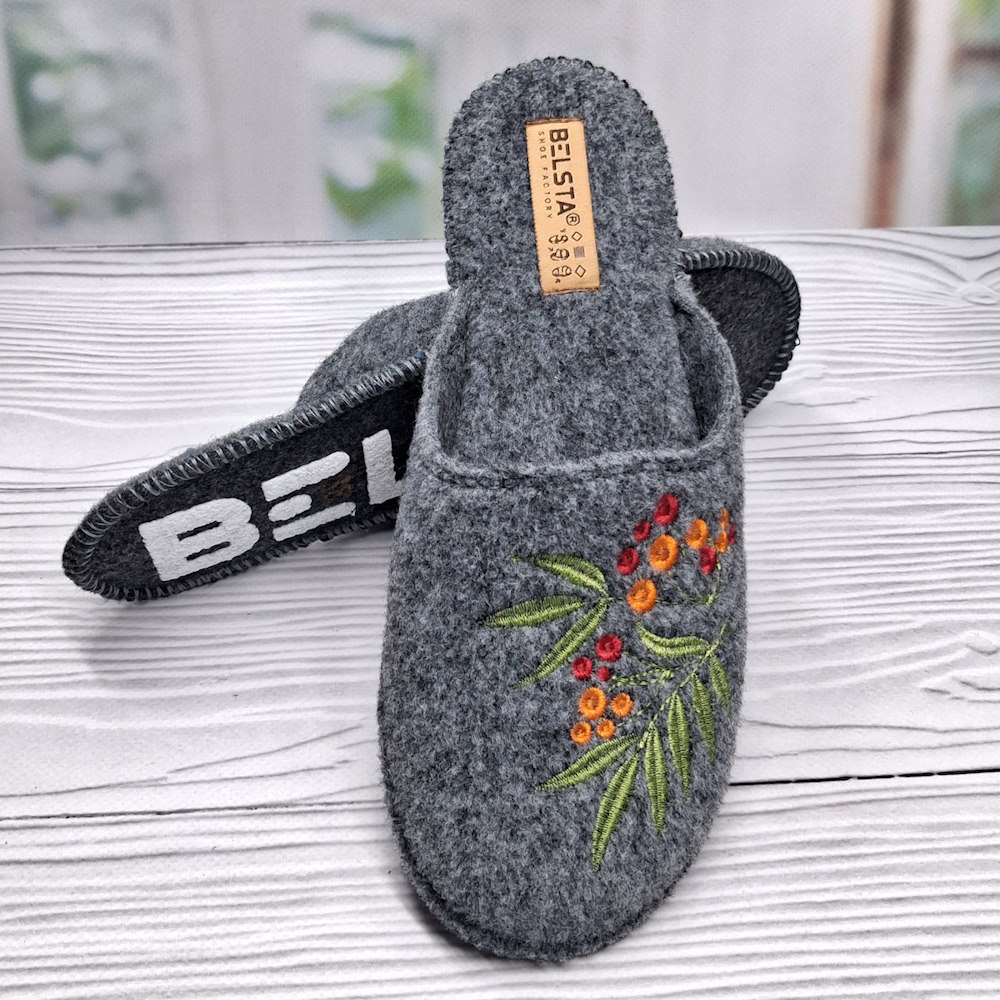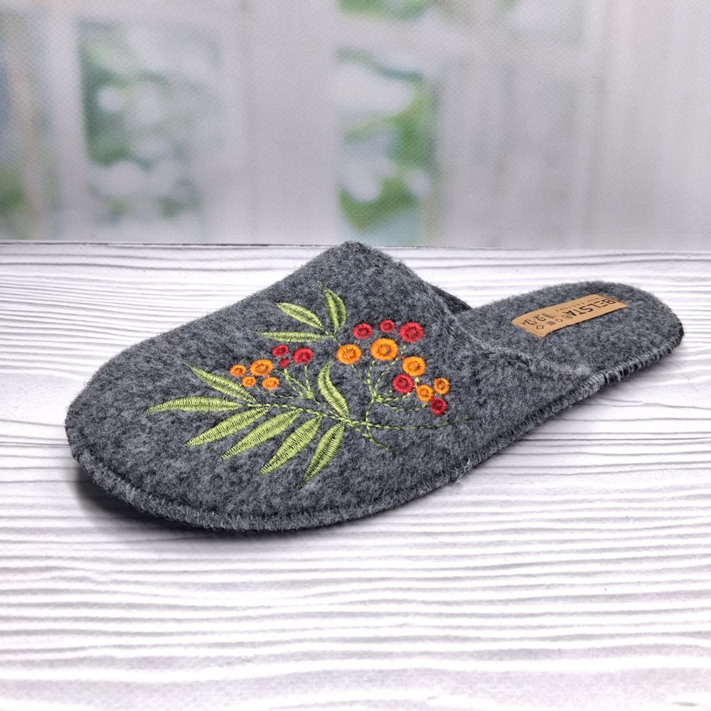 Женские комнатные тапочки ТМ Белста — тёплая и удобная модель для домашнего уюта. Тапочки выполнены из плотного фетра серого цвета, декорированы стильной вышивкой. Конструкция с закрытым носком сохраняет тепло, открытая пятка облегчает обувание, а подошва с противоскользящим покрытием обеспечивает уверенность при ходьбе. Идеальный вариант для комфорта и практичности в повседневной жизни.