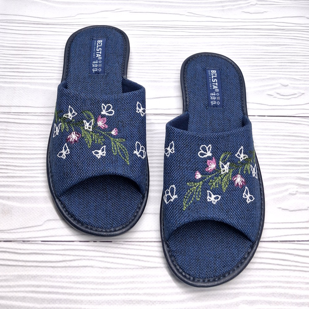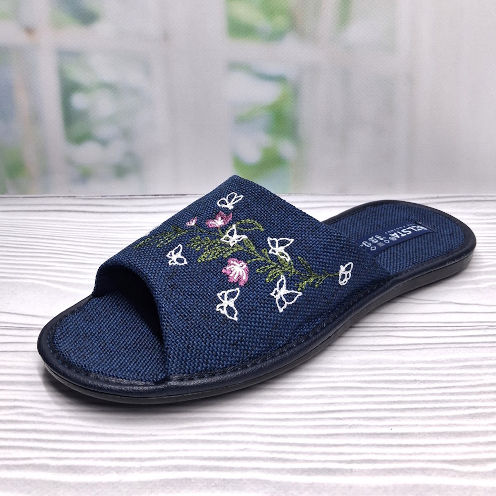 Женские домашние тапочки ТМ Белста — стильное и практичное решение для комфортного отдыха дома. Модель выполнена в насыщенном синем цвете и украшена оригинальной вышивкой с цветами и бабочками. Открытый носок и пятка делают тапочки лёгкими и удобными, текстильная стелька обеспечивает мягкость, а прочная полиуретановая подошва высотой 1 см устойчива к истиранию. Отличный выбор для лёгкости, комфорта и долговечности в повседневной носке.