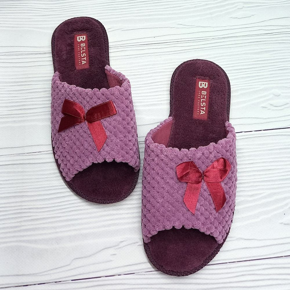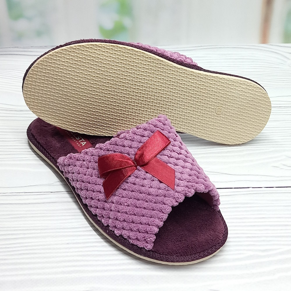 Женские домашние тапочки ТМ Белста — стильный выбор для уюта и комфорта. Модель выполнена в розовом цвете, украшена аккуратным бантиком из атласной ленты. Открытый носок обеспечивает лёгкость при носке, махровая стелька добавляет мягкости и тепла, микропористая резиновая подошва.