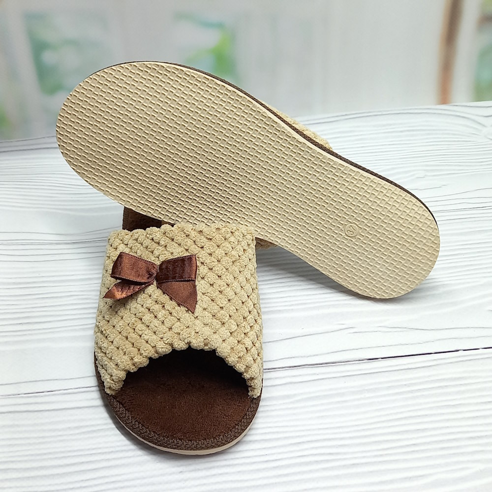 Домашние тапочки ТМ Белста для женщин — стильное и комфортное решение для дома. Бежевый цвет придаёт модели универсальный вид, а бантик из атласной ленты добавляет изысканности. Открытый носок обеспечивает вентиляцию, махровая стелька сохраняет тепло и мягкость, микропористая резиновая подошва гибкая и устойчива к износу.