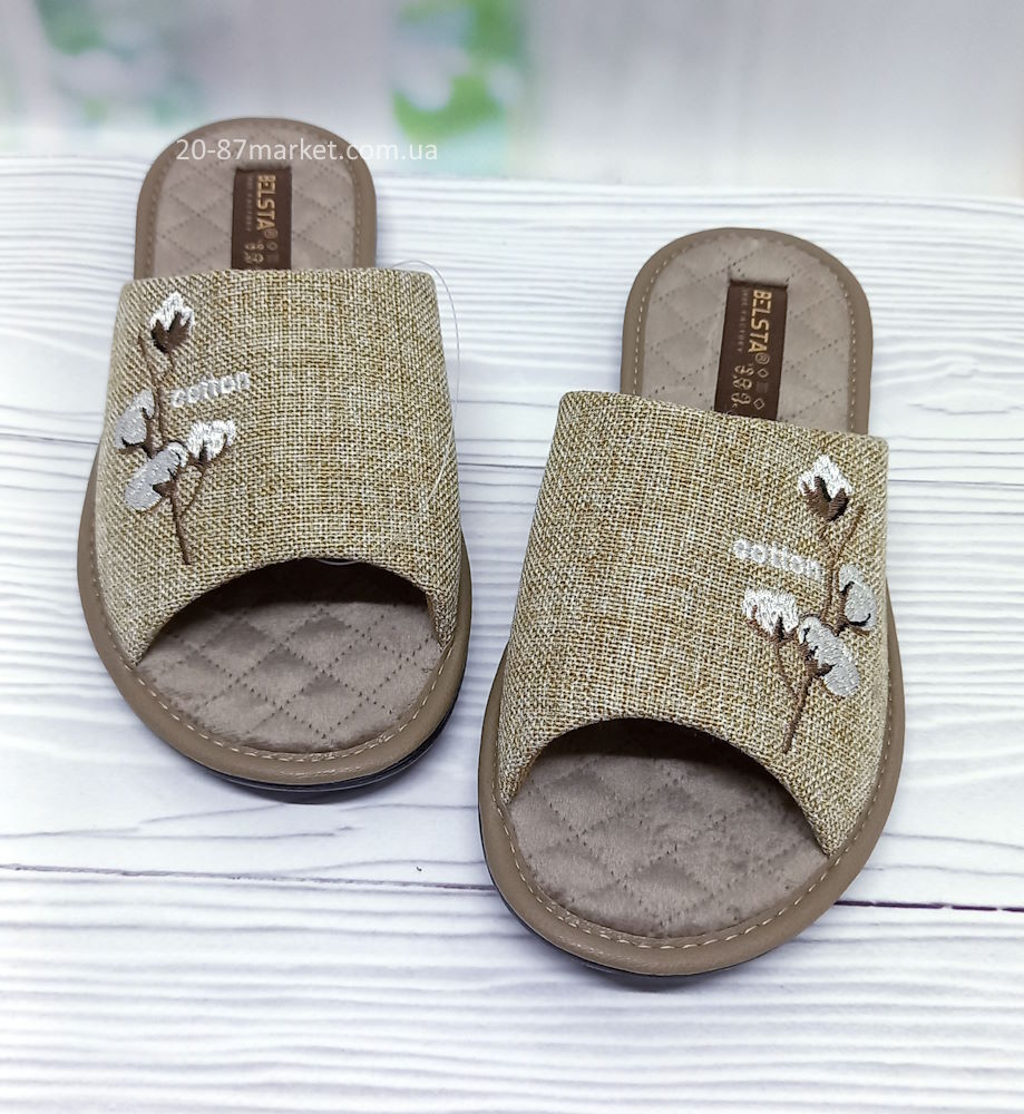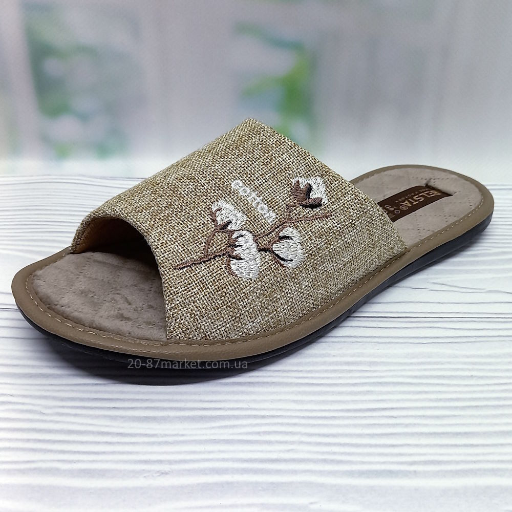 Женские тапочки тм Белста, открытый носок, бежевого цвета, украшены вышивкой, подошва полиуретановая, износостойкая, высота подошвы 1см.