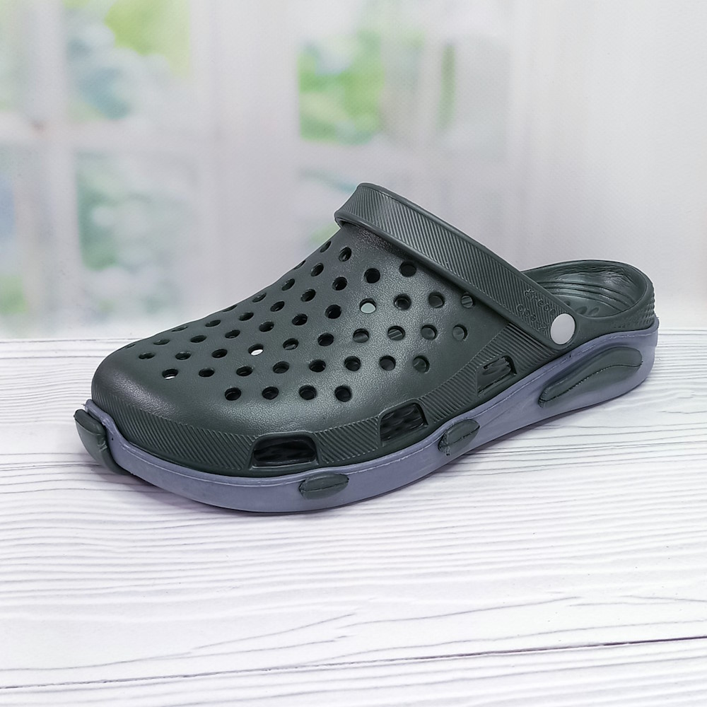 Кроксы мужские Кредо — зелёные с серой подошвой, износостойкие и лёгкие. Отлично сидят на ноге, быстро сохнут и легко моются. Подходят для отдыха, сада или пляжа.