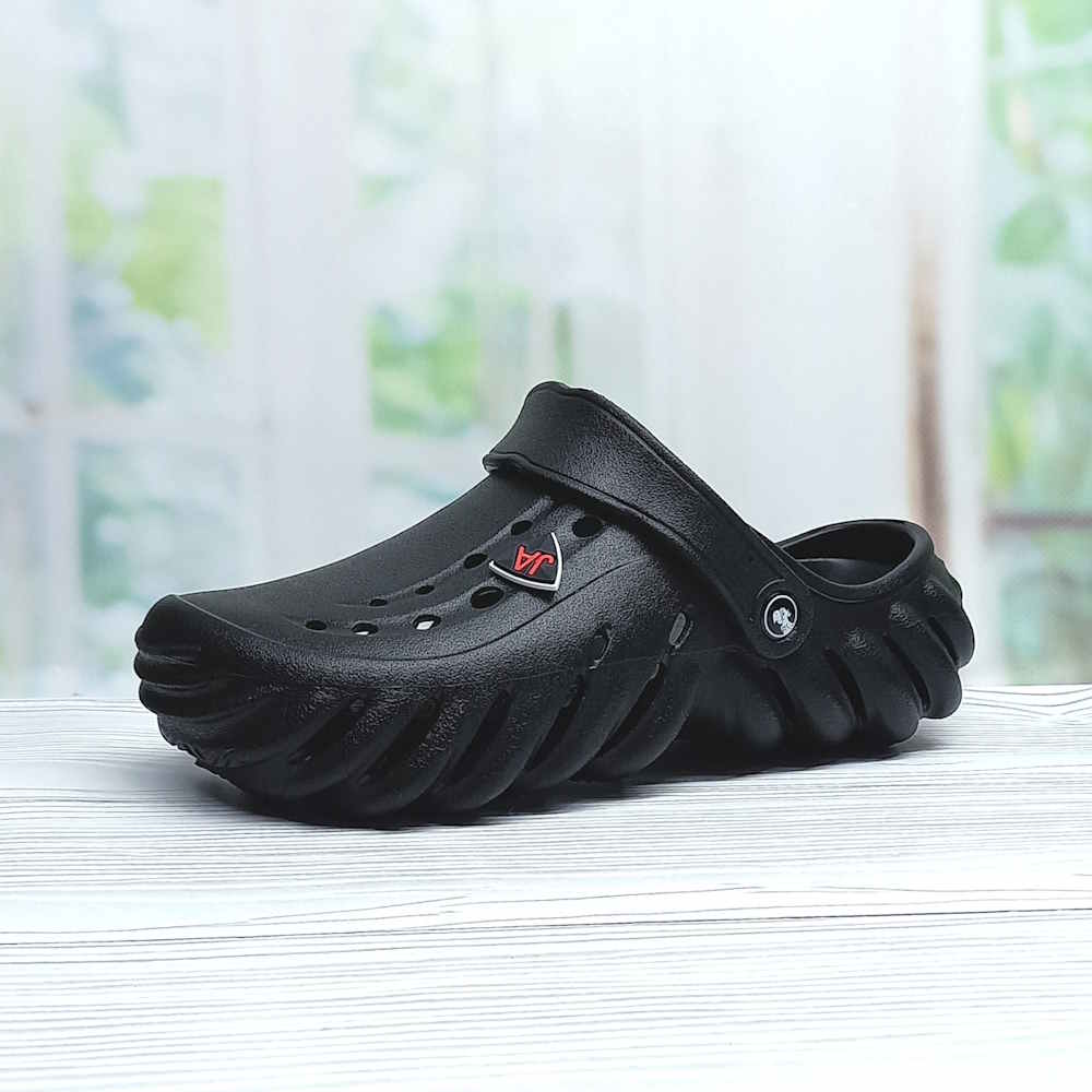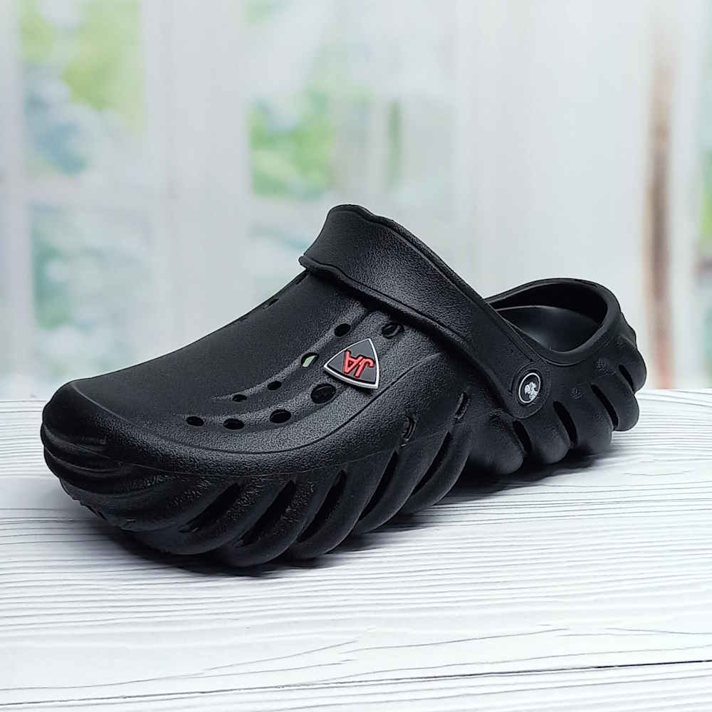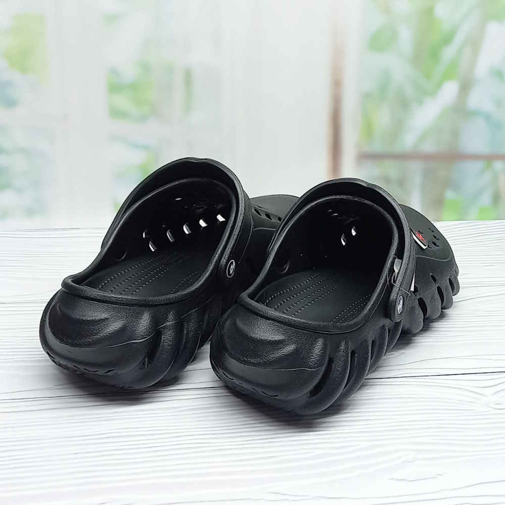 Чёрные кроксы из лёгкой ЭВА-пены обеспечивают комфорт при ходьбе и отлично подходят для ежедневного ношения. Перфорированный верх улучшает вентиляцию, а перекидной задник надёжно фиксирует обувь на ноге. Легко моются и быстро сохнут — отличный выбор для отдыха, дачи или пляжа.