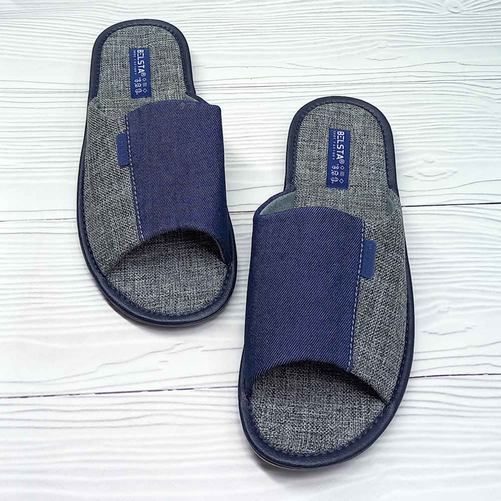 Тапочки с открытым носком и пяткой — отличное решение для дома в тёплое время года. Модель выполнена в стильных сине-серых тонах. Текстильная стелька обеспечивает мягкость при ходьбе, а прочная полиуретановая подошва устойчива к истиранию и не скользит. Практичный выбор для ежедневной носки.