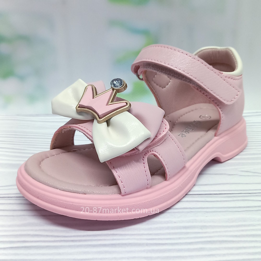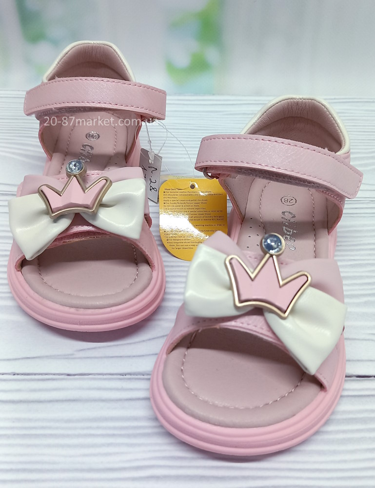 Босоніжки для дівчинки, ширина стопи регулюється липучкою, босоніжки прикрашені бантиком, короною та стразиком, застібки на якісних липучках. Шкіряна устілка, супінатор, твердий задник.