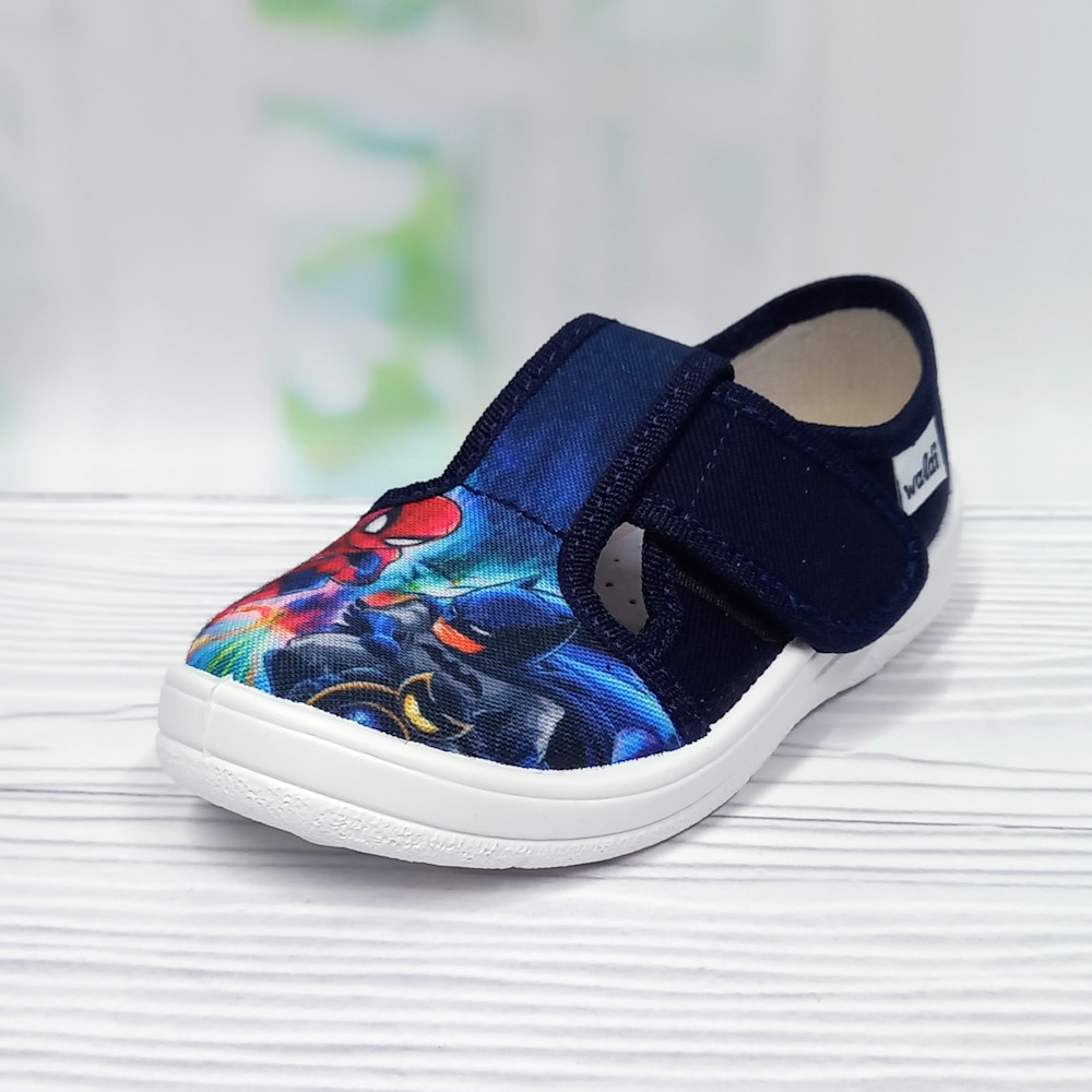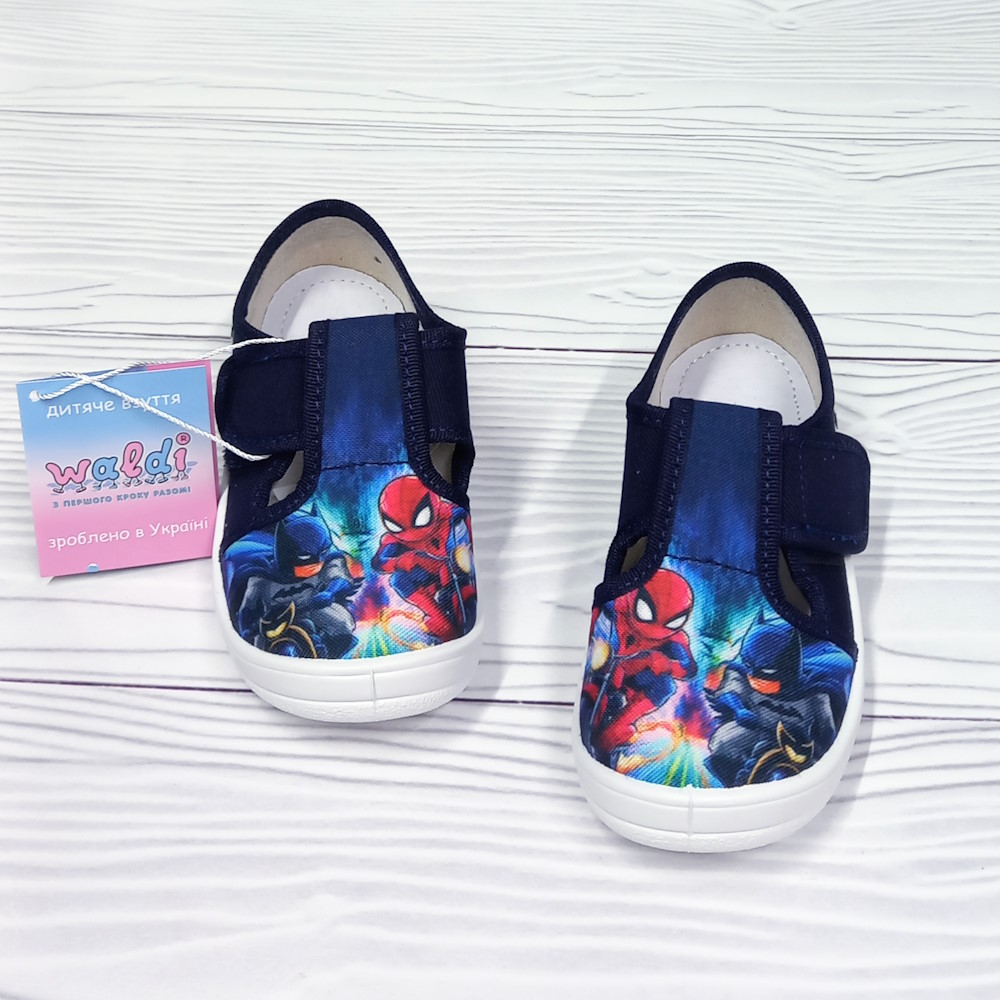 Капці дитячі тм Waldi, синього кольору, застібки на якісних липучках, принт – популярні персонажі з мультфільмів. Шкіряна устілка, супінатор, гнучка підошва білого кольору.