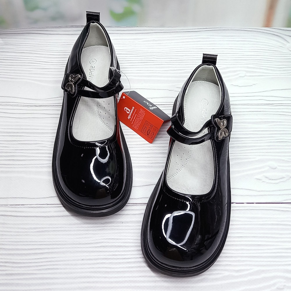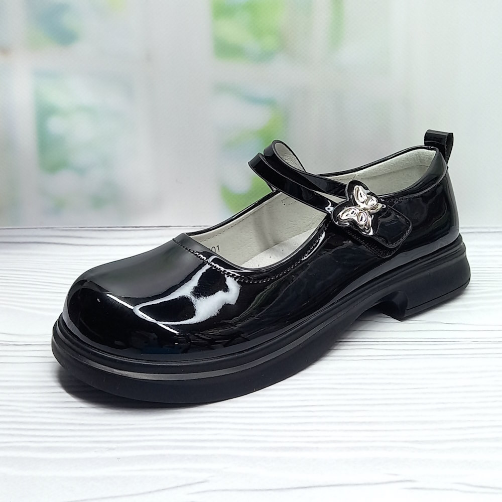 Стильні туфлі з лакованої еко-шкіри чудово підійдуть дівчинці для школи та святкових подій. Чорний колір робить модель універсальною, а зручні застібки на якісних липучках дозволяють швидко зафіксувати взуття на нозі. Усередині — м’яка шкіряна устілка, що забезпечує комфорт під час тривалої носки. Легкі, охайні та практичні — чудовий вибір для маленької леді.