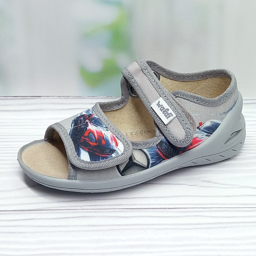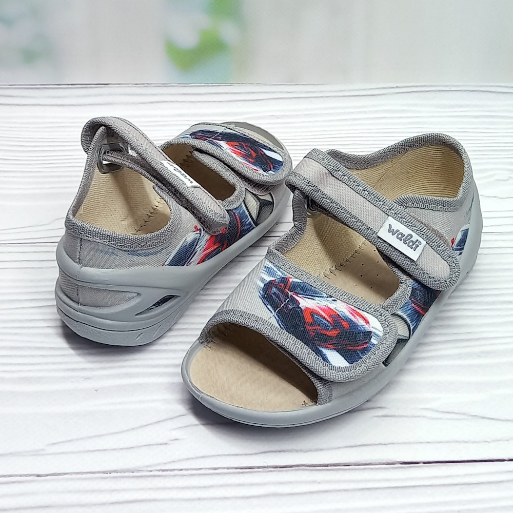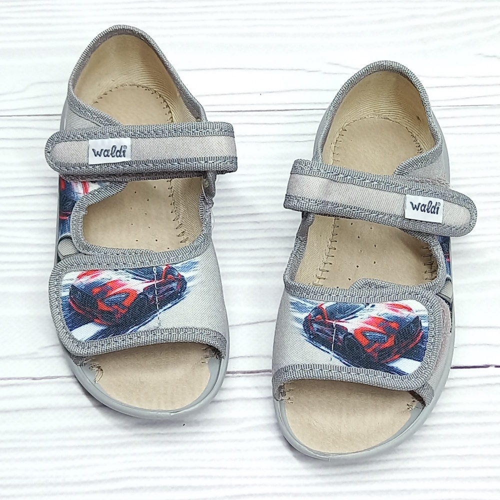 Дитячі текстильні сандалії ТМ Waldi — практична модель для хлопчика з яскравим акцентом у вигляді стильного принта-машинки. Сірий текстильний верх добре пропускає повітря, а відкритий носок і закрита п’ятка забезпечують комфорт і підтримку стопи. Зручні липучки, включно з регулюванням за повнотою, дозволяють легко підлаштувати взуття під ногу дитини. Гнучка ПВХ підошва робить кроки м’якими та стійкими — ідеально для щоденної активності.