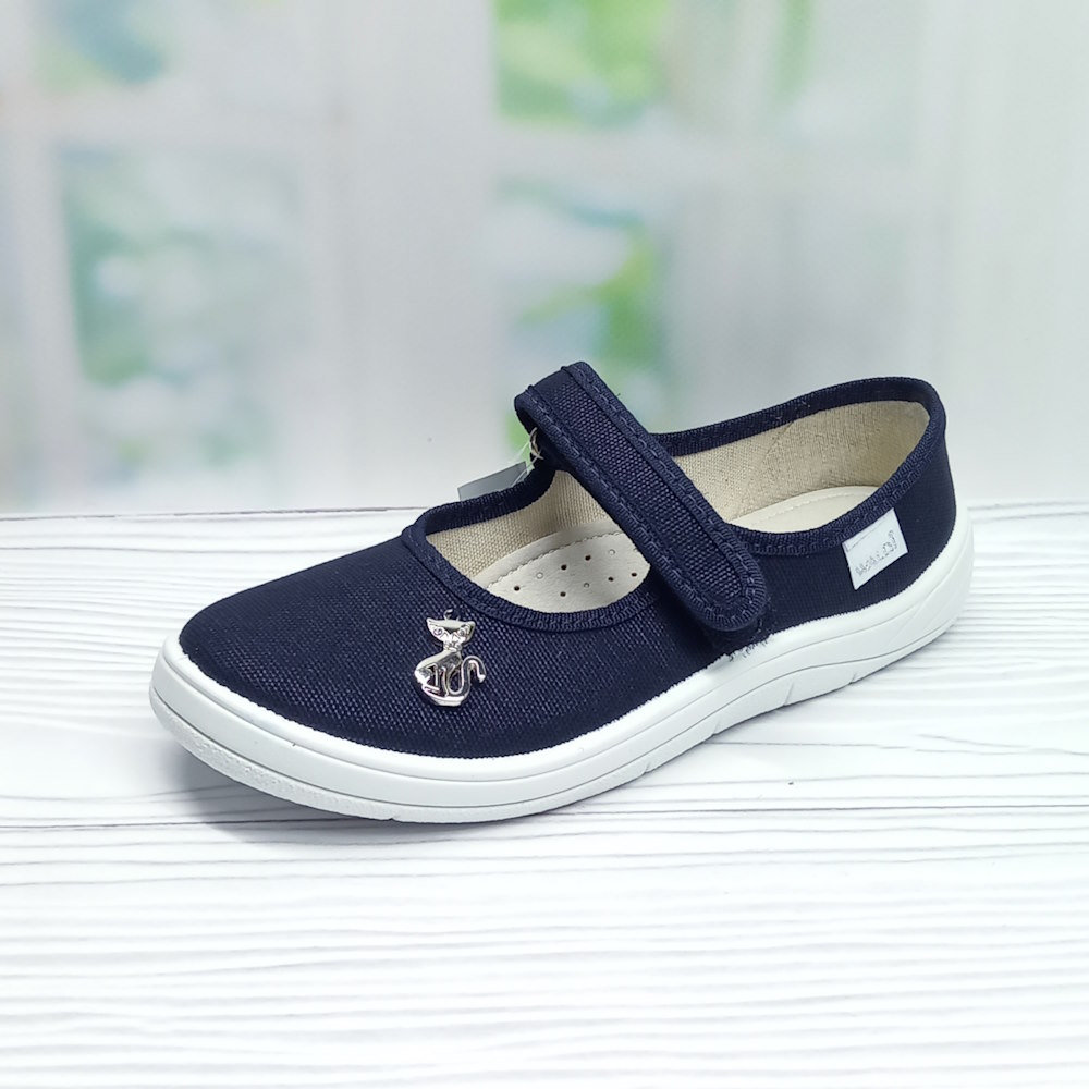 👟 Дитячі текстильні капці Waldi для дівчинки — зручне та практичне змінне взуття для школи. Виконані у синьому кольорі та прикрашені милою підвіскою-кішечкою, що сподобається маленьким модницям. Застібки на якісних липучках забезпечують легке взування й надійну фіксацію стопи. Шкіряна устілка з супінатором гарантує комфорт під час тривалого носіння, а біла гнучка підошва робить кроки легкими та природними.