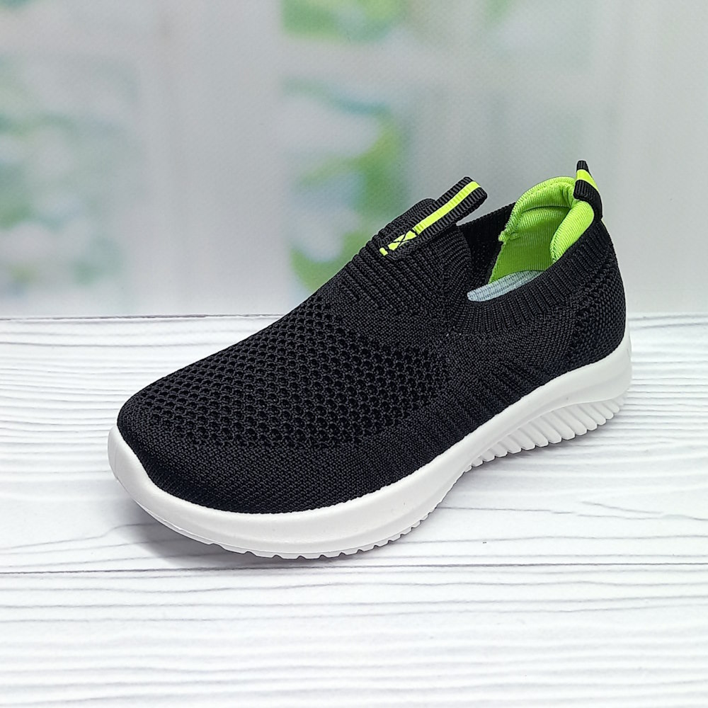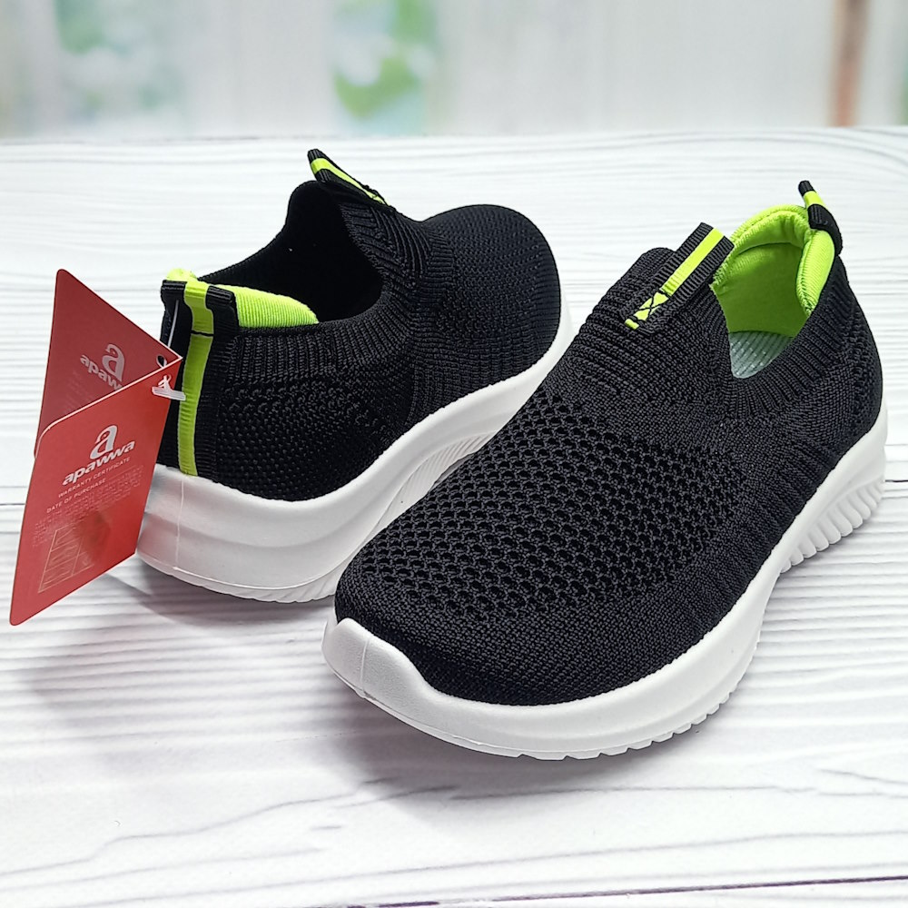 👟 Дитячі текстильні кросівки для хлопчика ТМ Apawwa — практичне та легке взуття для активних прогулянок. Верх виконаний із дихаючої сітки у чорному кольорі з яскравими салатовими акцентами. Така комбінація не лише стильно виглядає, але й забезпечує вентиляцію стопи. Текстильна устілка дарує комфорт, а біла гнучка підошва з піни амортизує кроки, роблячи модель зручною для щоденного носіння у весняно-літній сезон.