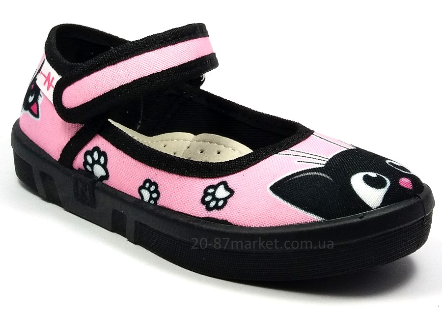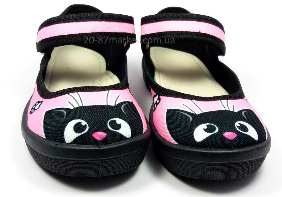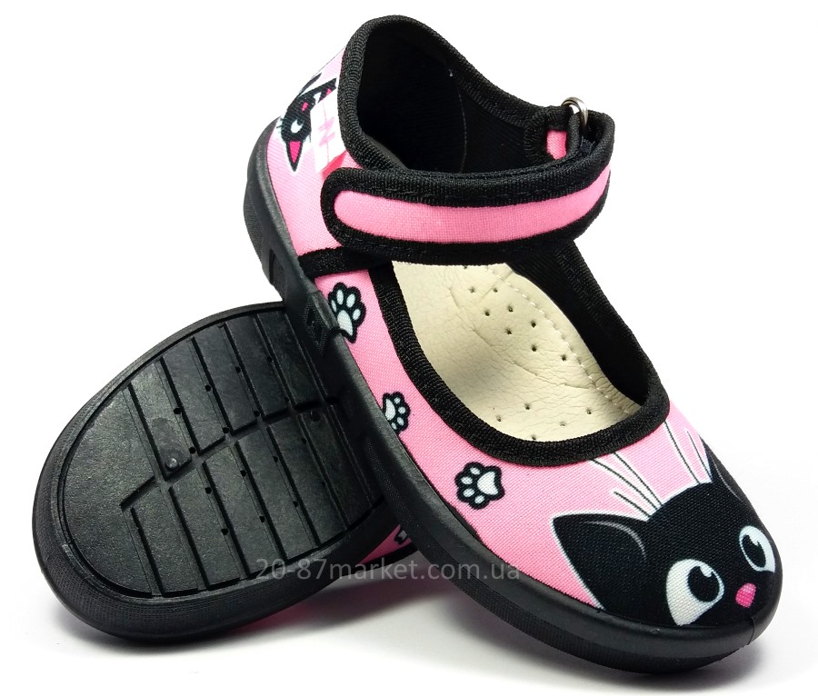 Рожеві капці для дівчинки, принт - "кицька", твердий задник, шкіряна устілка, супінатор. Підошва чорного кольору.