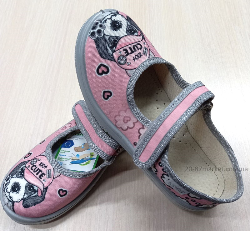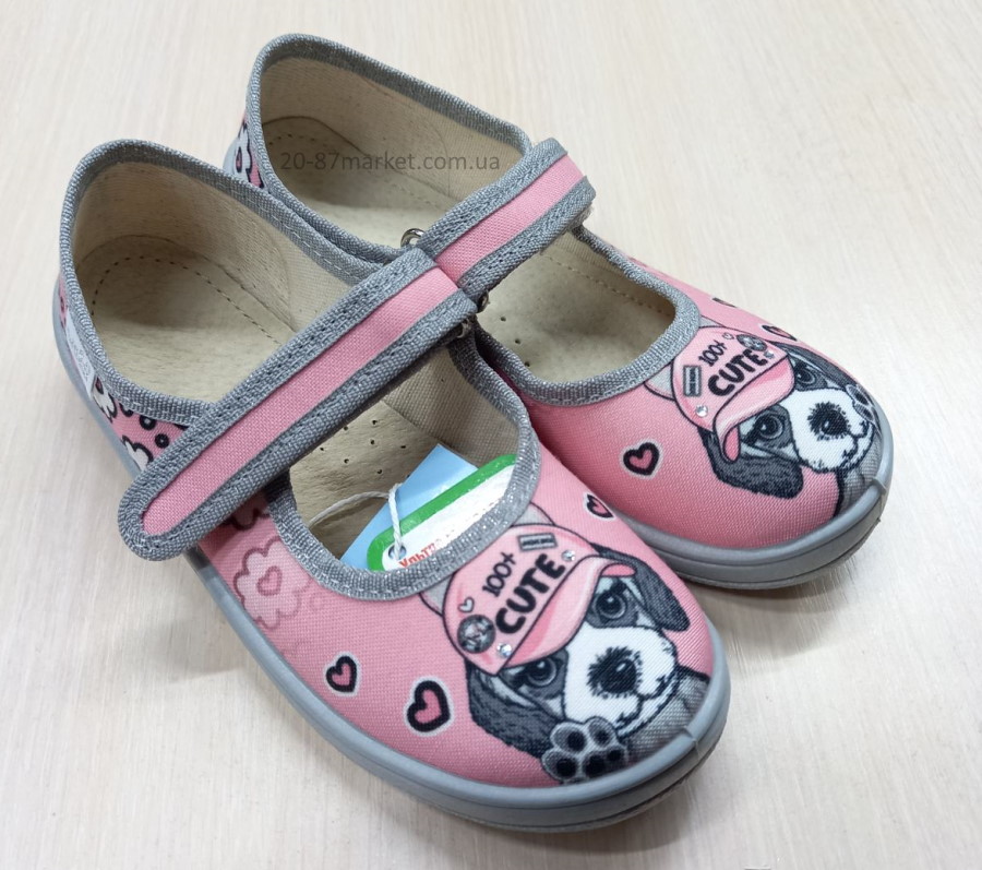 Капці рожеві, для дівчинки, застібка на липучках, принт: "Собачка в бейсболці". Шкіряна устілка, супінатор. Колір підошви – сірий.