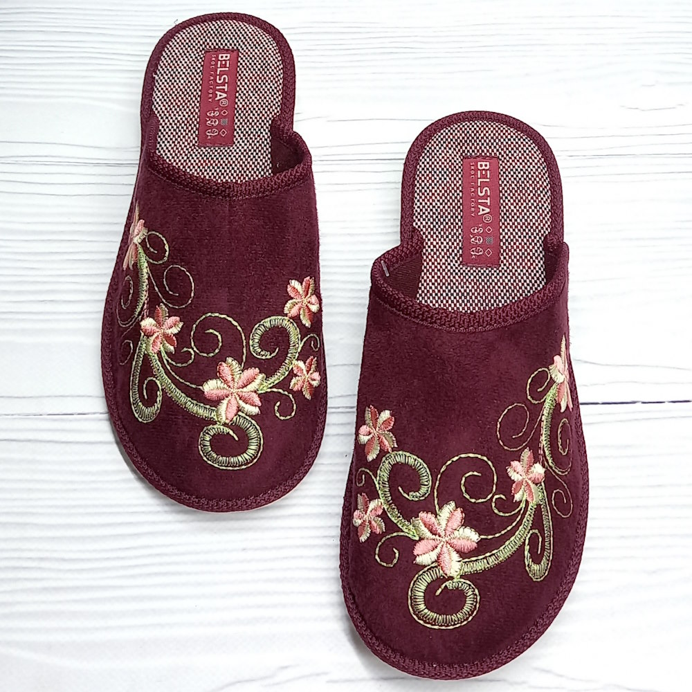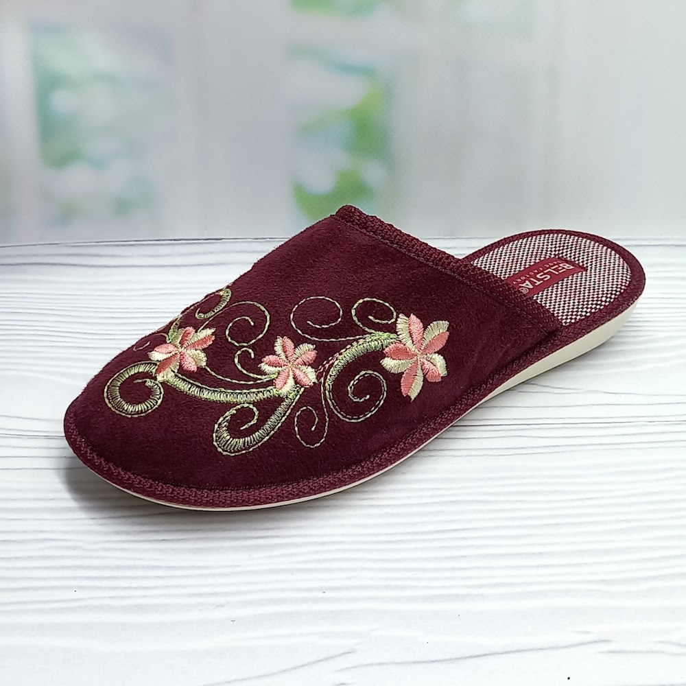 Капці виконані в насиченому бордовому кольорі, прикрашені акуратною вишивкою, закритий носок захищає стопу, а відкрита п’ятка забезпечує зручність під час носіння.