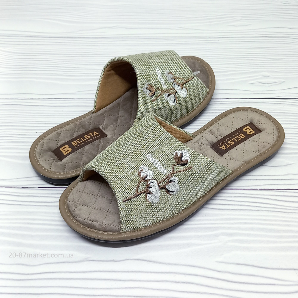 Жіночі кімнатні капці тм Белста, відкритий перед, прикрашені вишивкою - квітки бавовни, поліуретанова підошва, зносостійка, висота підошви 1см.