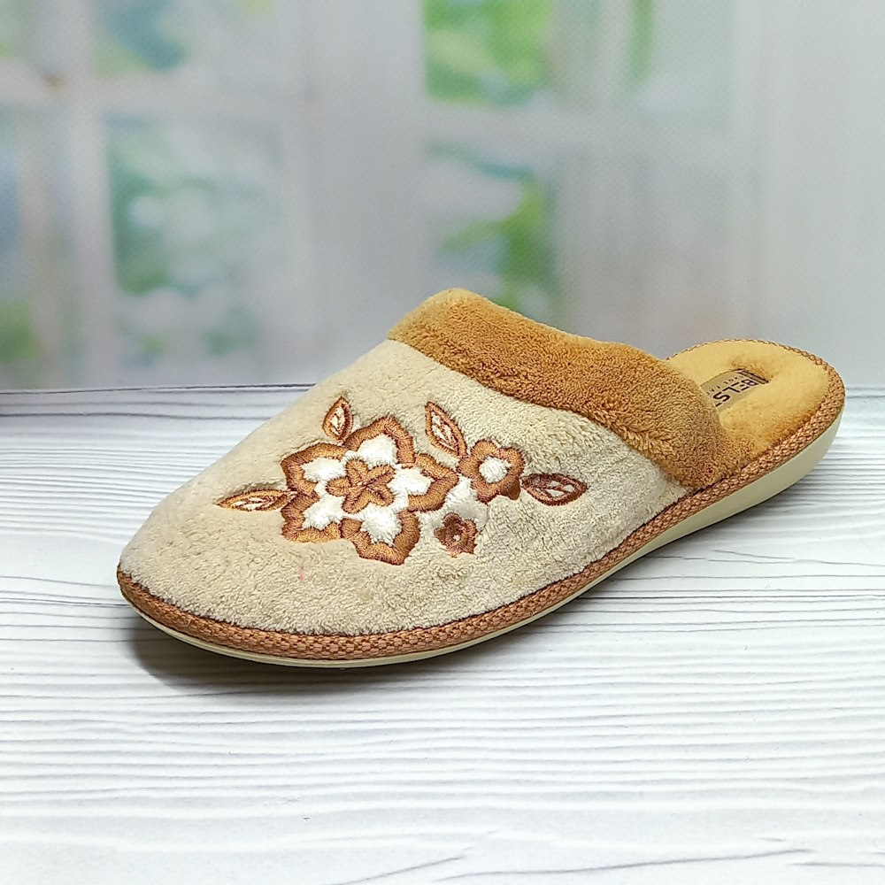 Жіночі кімнатні капці ТМ Белста — зручна модель для домашнього затишку та відпочинку. Махровий верх бежевого кольору приємний до ноги, добре утримує тепло та забезпечує вентиляцію. Закритий носок захищає від прохолоди, а відкрита п’ятка робить капці зручними для щоденного використання. Текстильна устілка додає м’якості під час ходьби, а міцна поліуретанова підошва заввишки 2,5 см біля п’ятки вирізняється зносостійкістю та стабільністю.