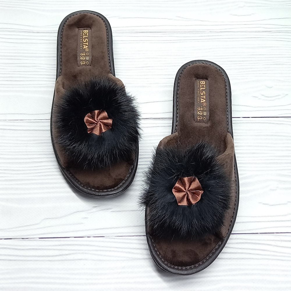 Жіночі домашні велюрові капці тм Белста, відкритий перед, "пухнаста" прикраса. Велюрова устілка, підошва поліуретан. Висота п'яти 2,5см.