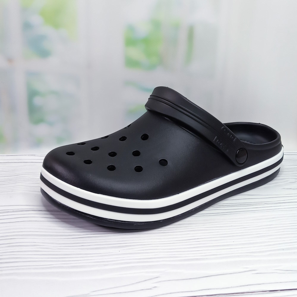 Чорні крокси виготовлені з легкої піни ЕВА, завдяки чому майже не відчуваються на нозі. Перфорований верх забезпечує хорошу вентиляцію, а перекидний задник-лямка надійно фіксує взуття під час ходьби. Чудовий вибір для дачі, відпочинку або щоденного використання.