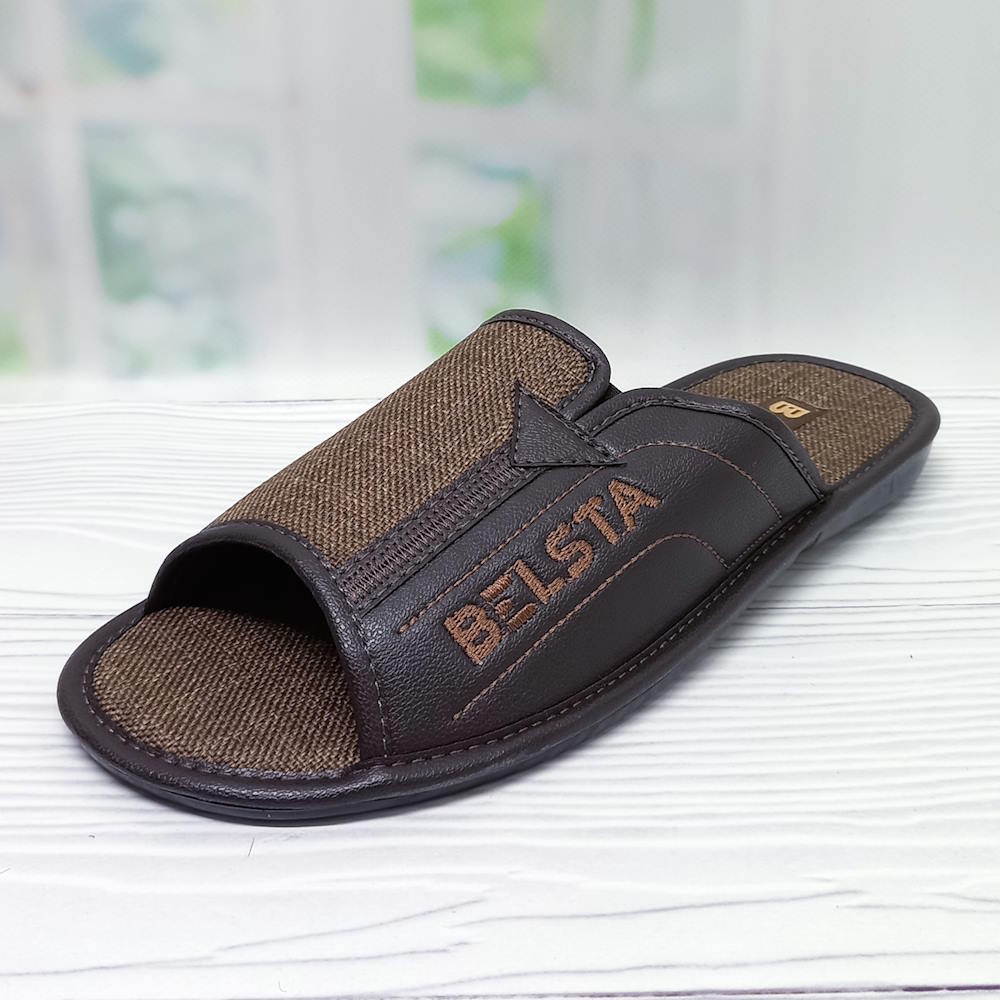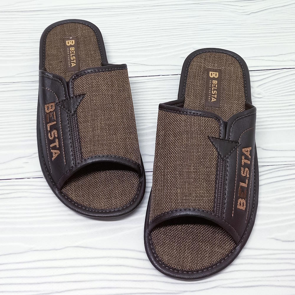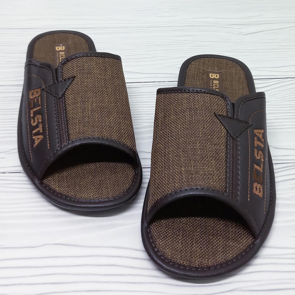 Чоловічі домашні капці тм Белста з відкритим передом, верх капців текстильний, устілка текстильна. Стійка до стирання поліуретанова підошва.