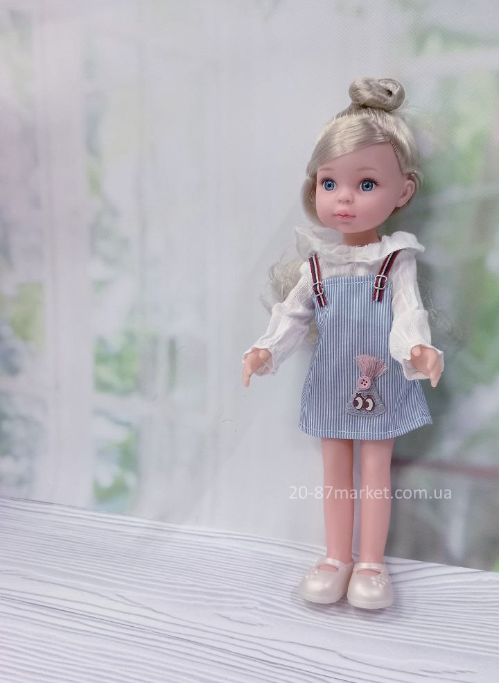 Очень симпатичная кукла в стильной одежде из качественного текстиля. Подвижные ручки и ножки, длинные волнистые волосы, съёмные ботиночки, высота куклы 33см. Кукла изготовленна из качественного пластика. Упакована в картонную коробку.