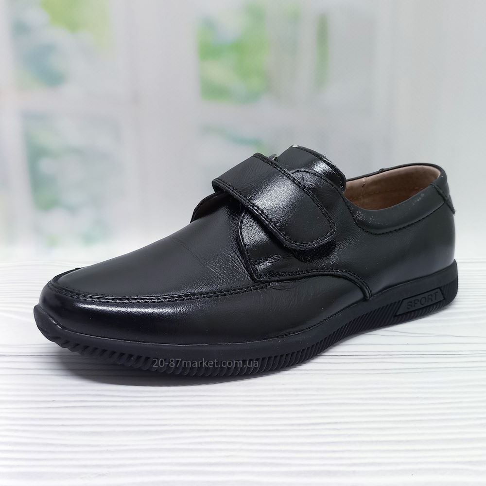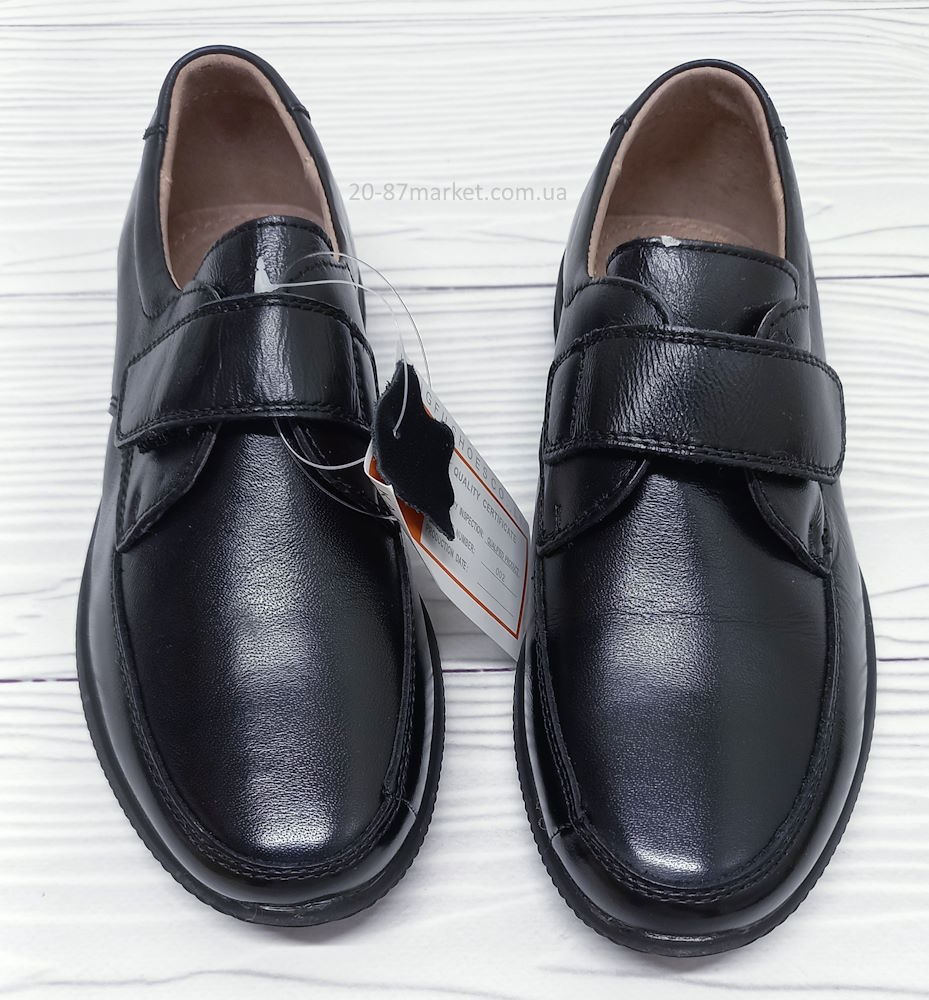 Детские кожаные туфли для мальчика, верх обуви натуральная кожа, подкладка экокожа, кожаная комбинированная стелька, супинатор, застёжка на липучке, чёрная подошва ПВХ.
