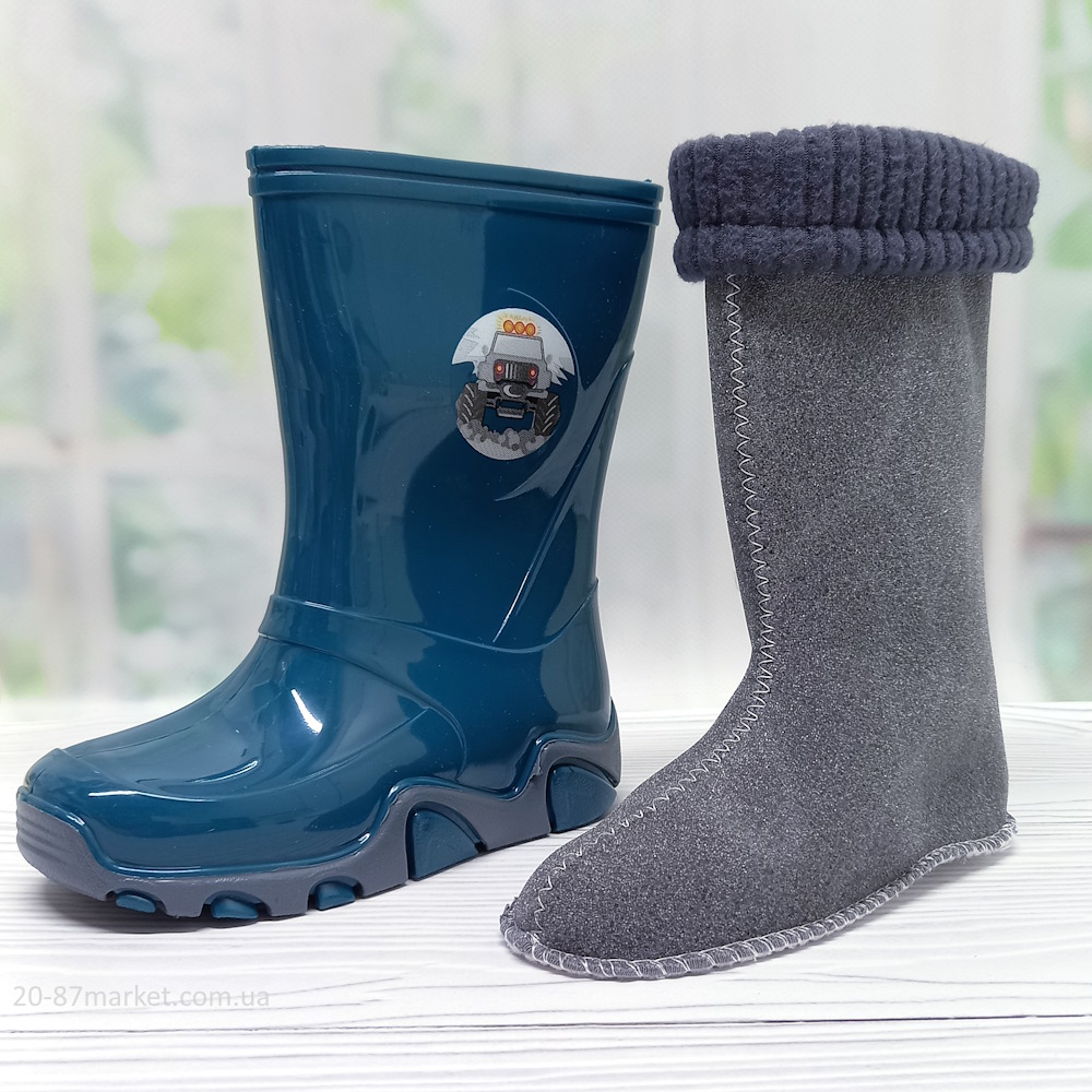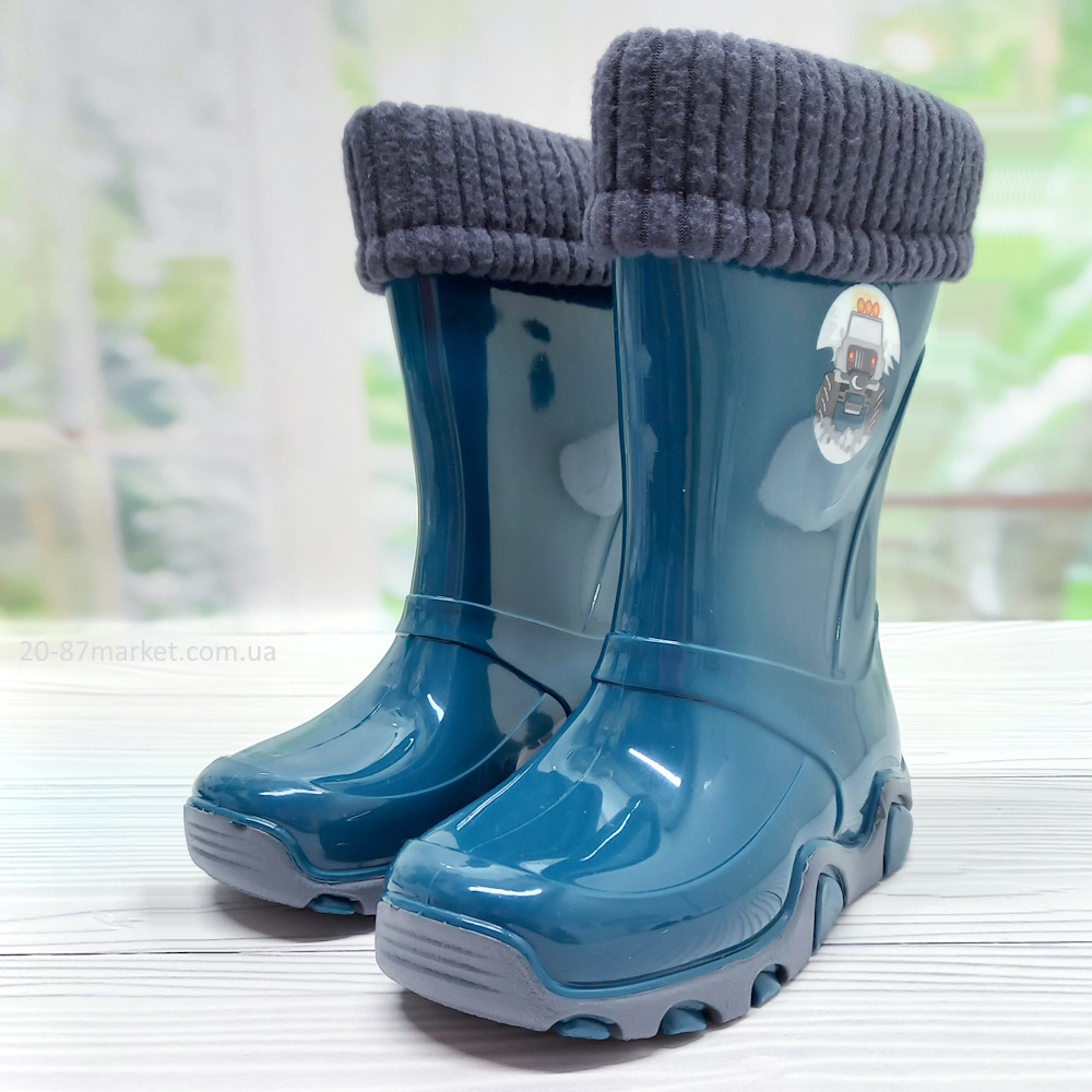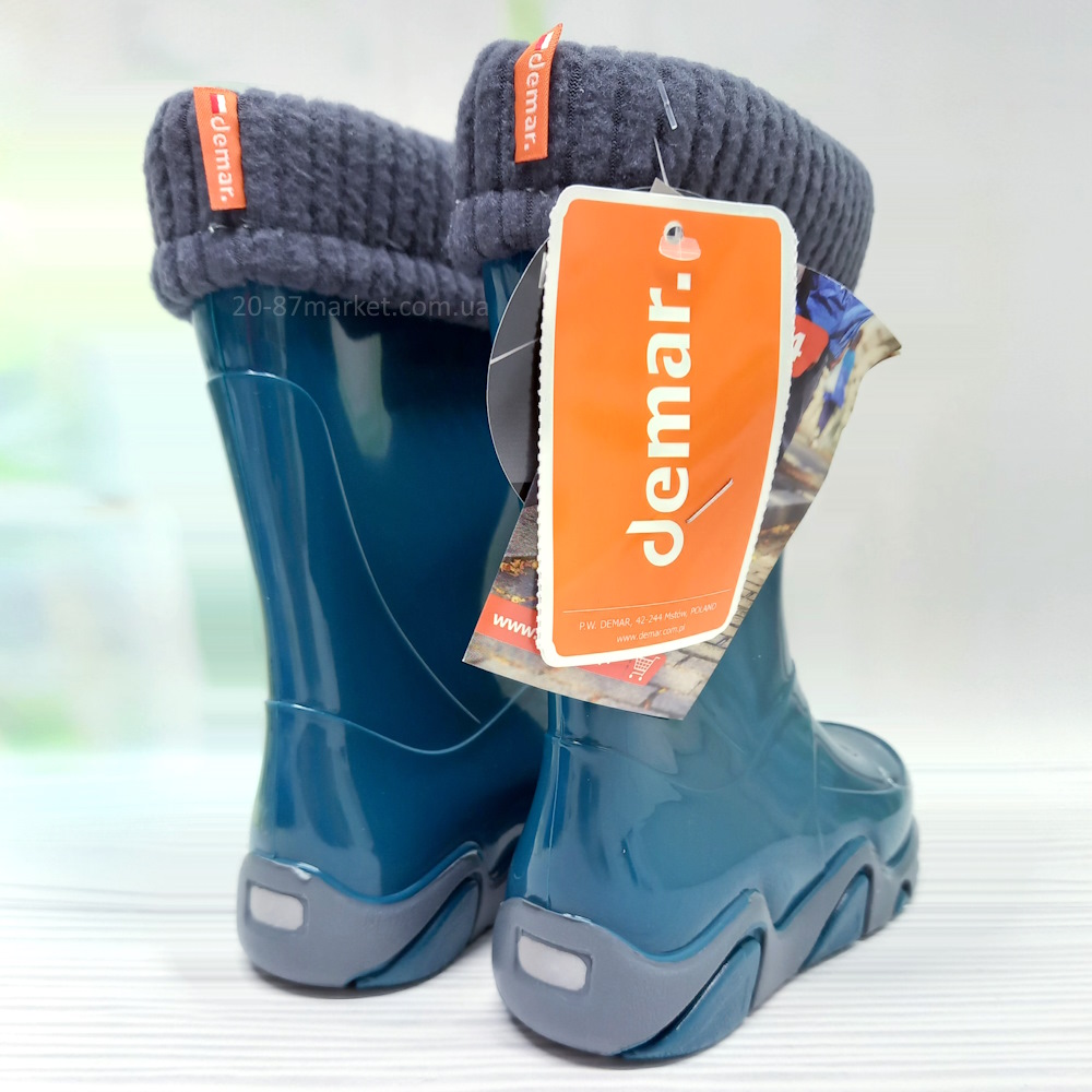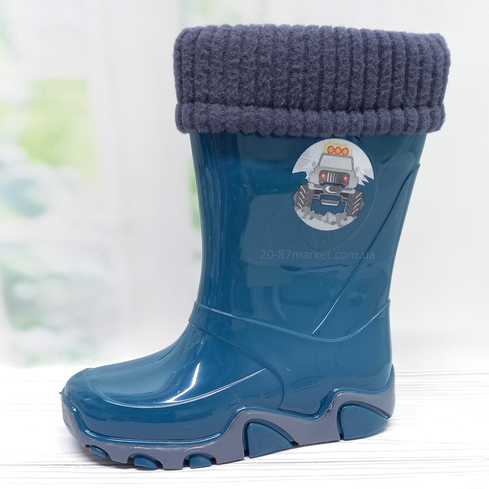 Детские резиновые сапожки (ПВХ) для мальчика, тм Demar, синего цвета, текстильные вынимающиеся вставки-чулки. Нескользкая подошва, сзади светоотражатели.