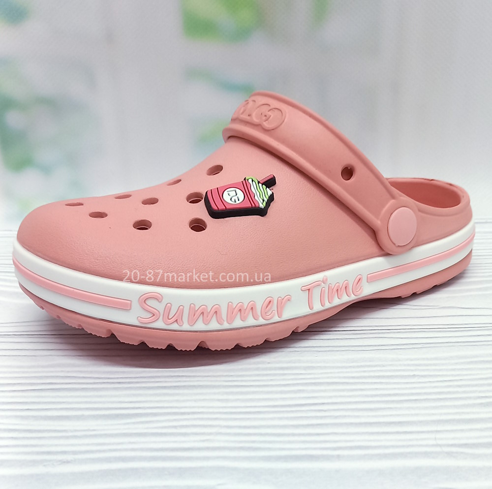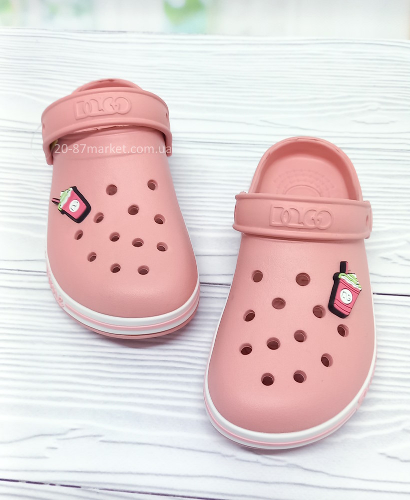 Кроксы для девочки тм DAGO персикового цвета. Перфорированный верх улучшает вентиляцию стопы, перекидной задник-лямка надёжно фиксирует обувь на ноге.
