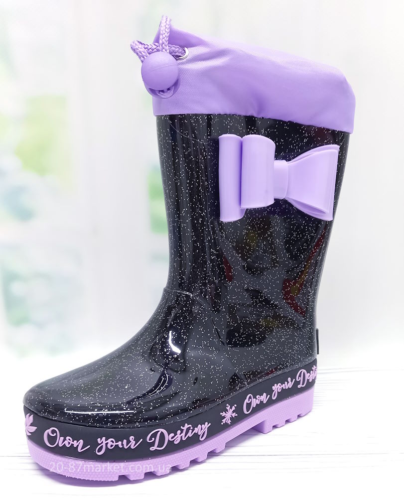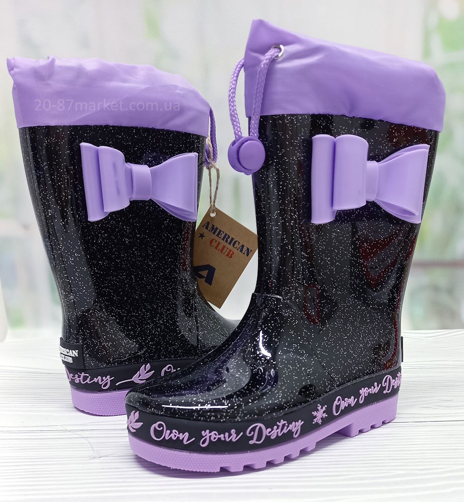 - Резиновые сапоги для девочки, р.26-30, арт.34576, American Club, чёрно-фиолетовые, бантик
