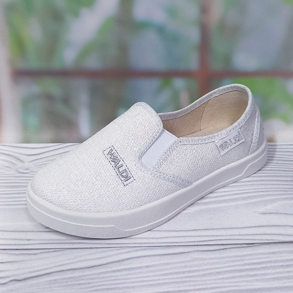 Белые текстильные слипоны тм Waldi для девочки. Подошва белая, твёрдый задник, стелька из натуральной кожи, супинатор.