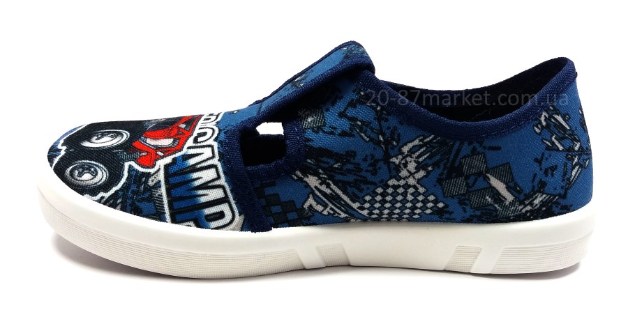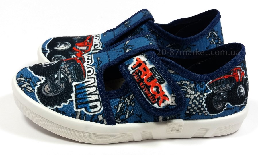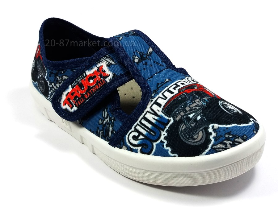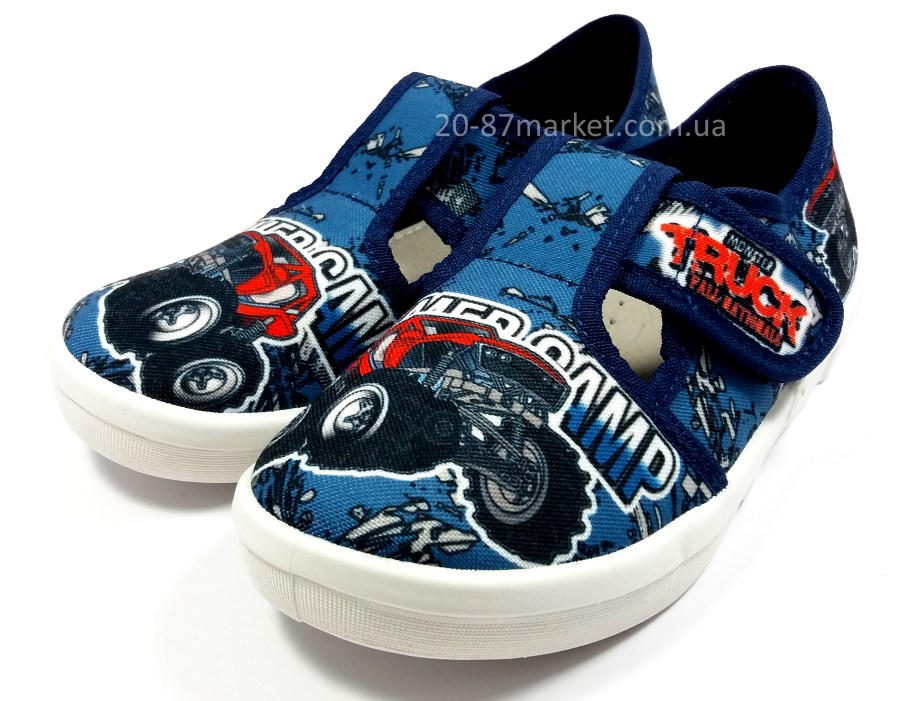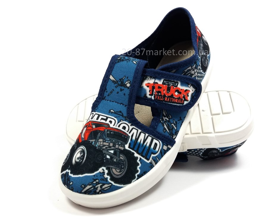 Тапочки для мальчика на липучках синего цвета, принт "Машина", кожаная стелька, супинатор. Белая вентилируемая подошва.
