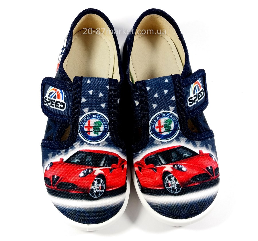 Тапочки синего цвета на липучках для мальчика, принт - Машина красного цвета. Кожаная стелька, супинатор. Подошва белого цвета.