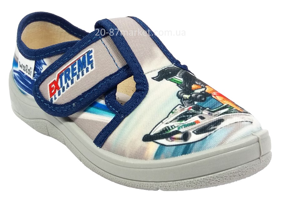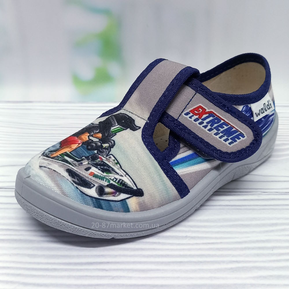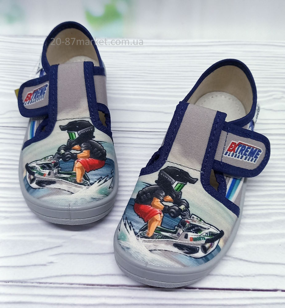 Тапочки серого цвета на липучках для мальчика, принт - парень на водном мотоцикле. Кожаная стелька, супинатор. Подошва серого цвета.