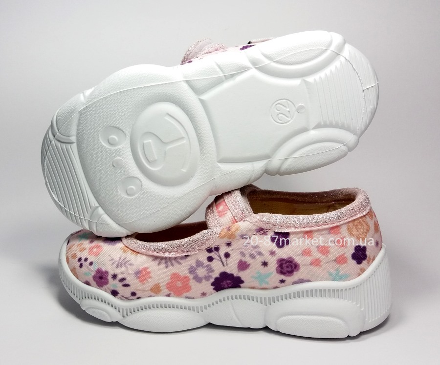 Тапочки для девочки на липучках. Кожаная стелька, супинатор. Подошва белого цвета, на подошве рельеф медведя.