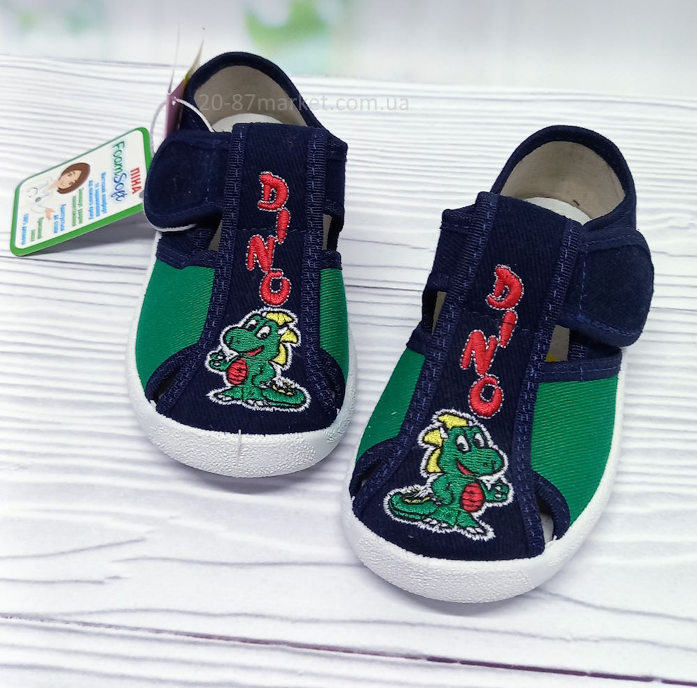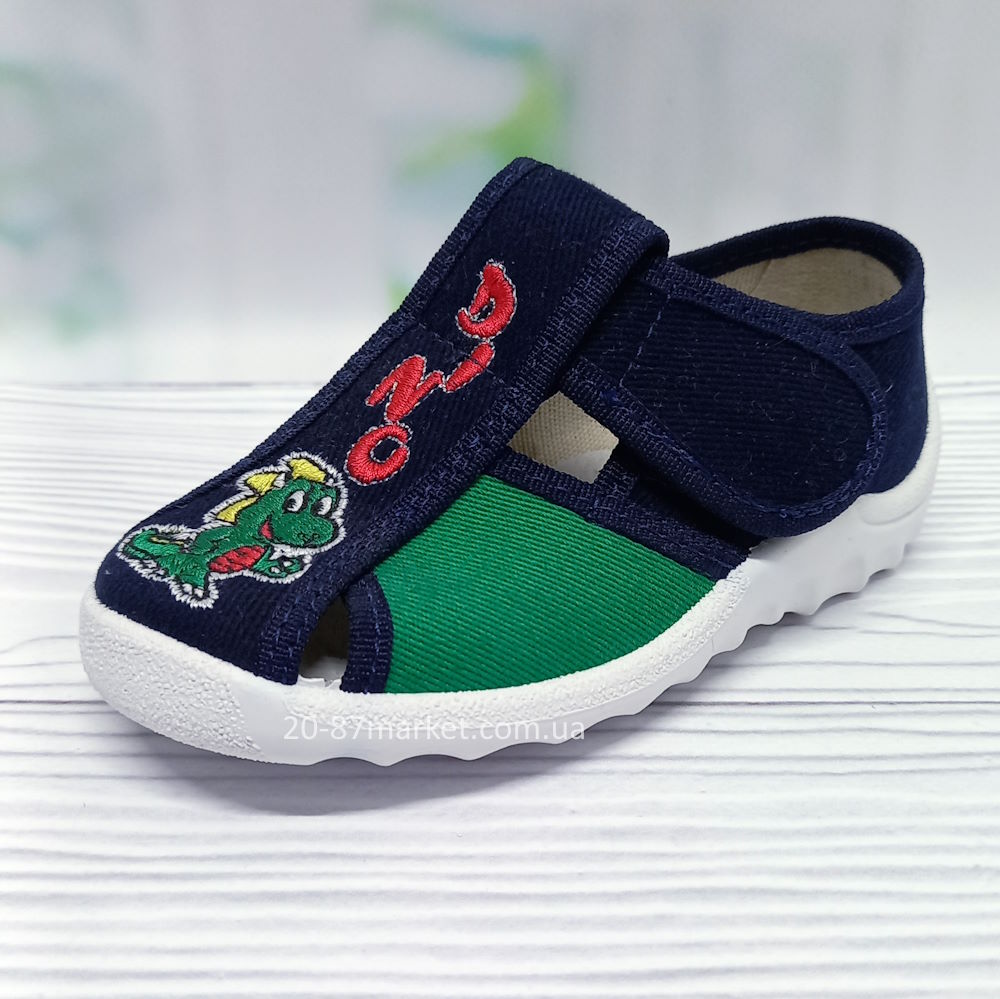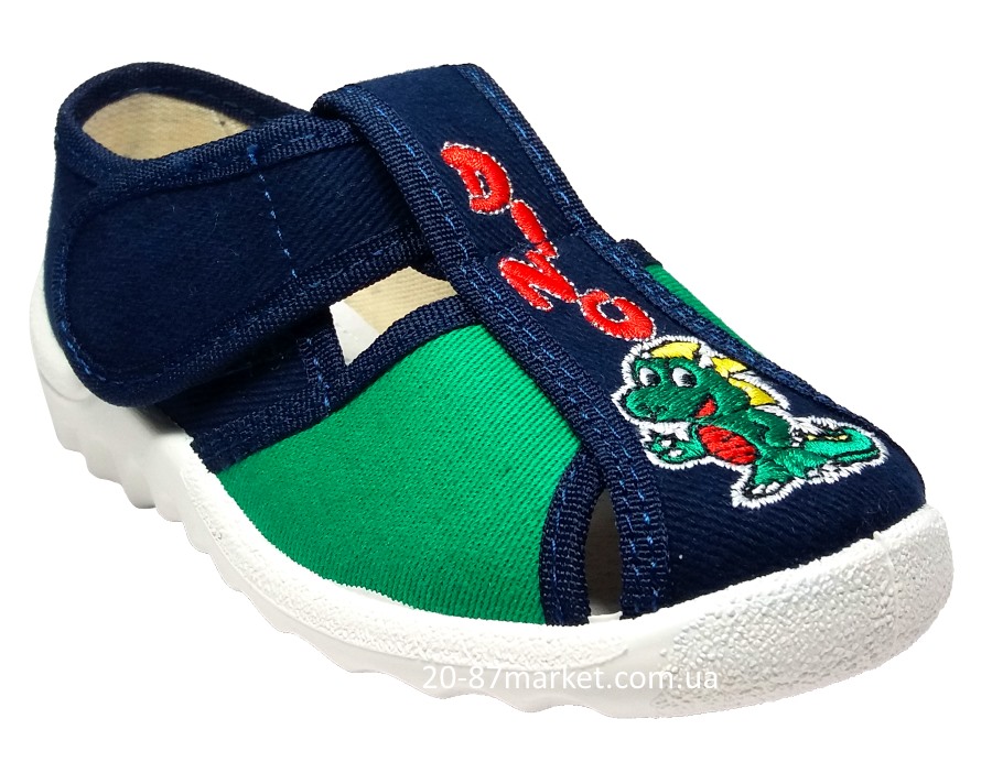 Тапочки синего цвета на липучках, для мальчика. Вышивка - динозаврик. Кожаная стелька, супинатор. Подошва белого цвета.