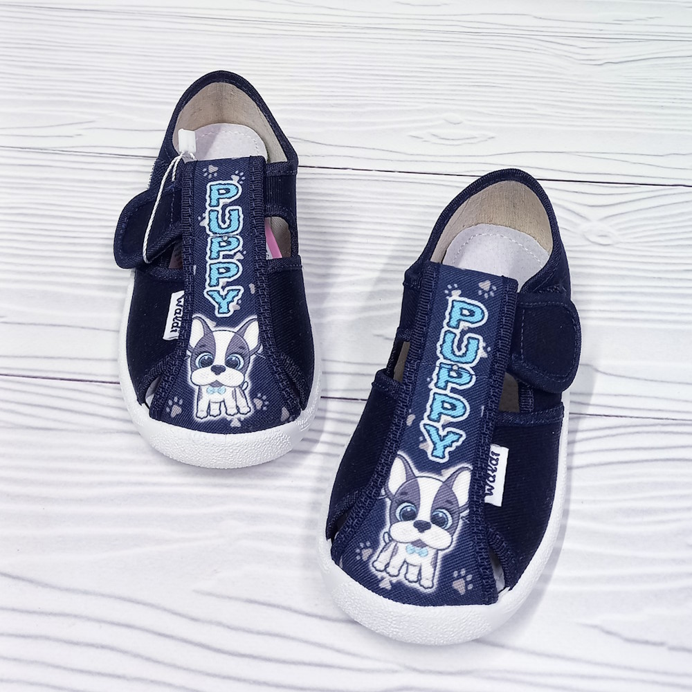 Детские тапочки тм Waldi синего цвета, застёжки на липучках, для мальчика. Принт - щенок. Кожаная стелька, супинатор. Подошва белого цвета.
