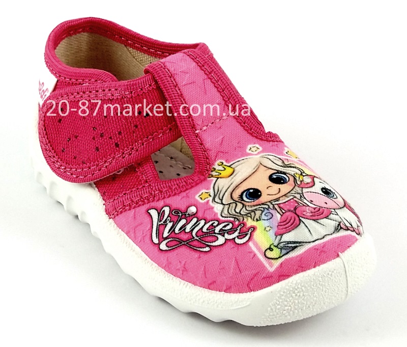 Тапочки для девочки на липучках, с принтом - принцессы. Кожаная стелька, супинатор. Подошва белого цвета.
