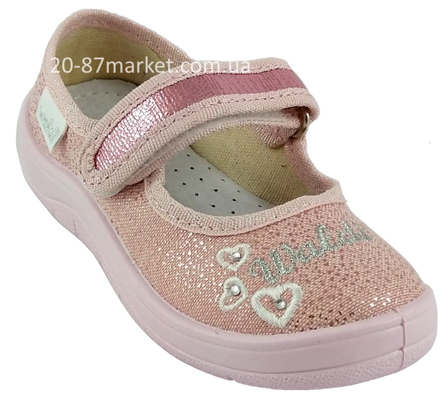 Тапочки для девочки на липучках, с вышивкой - сердечки. Кожаная стелька, супинатор. Подошва розового цвета.