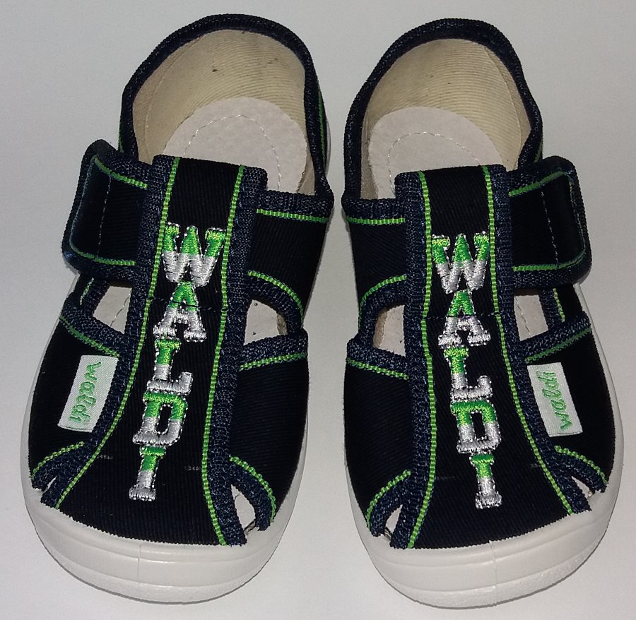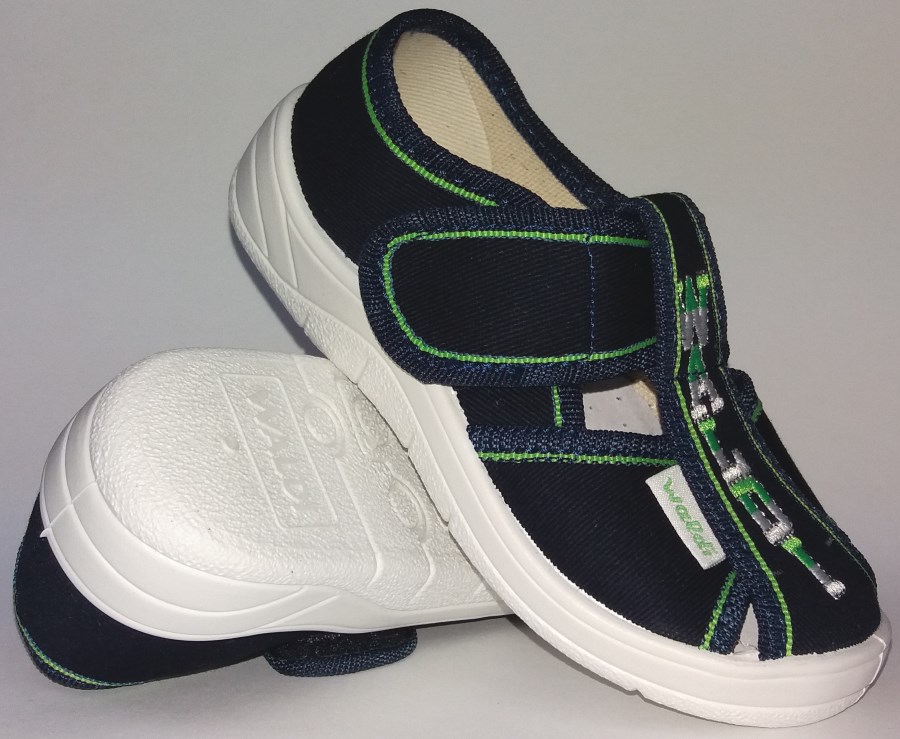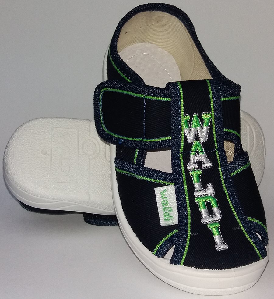 Тапочки детские, на липучках, с надписью Waldi. Кожаная стелька, супинатор. Подошва белого цвета.