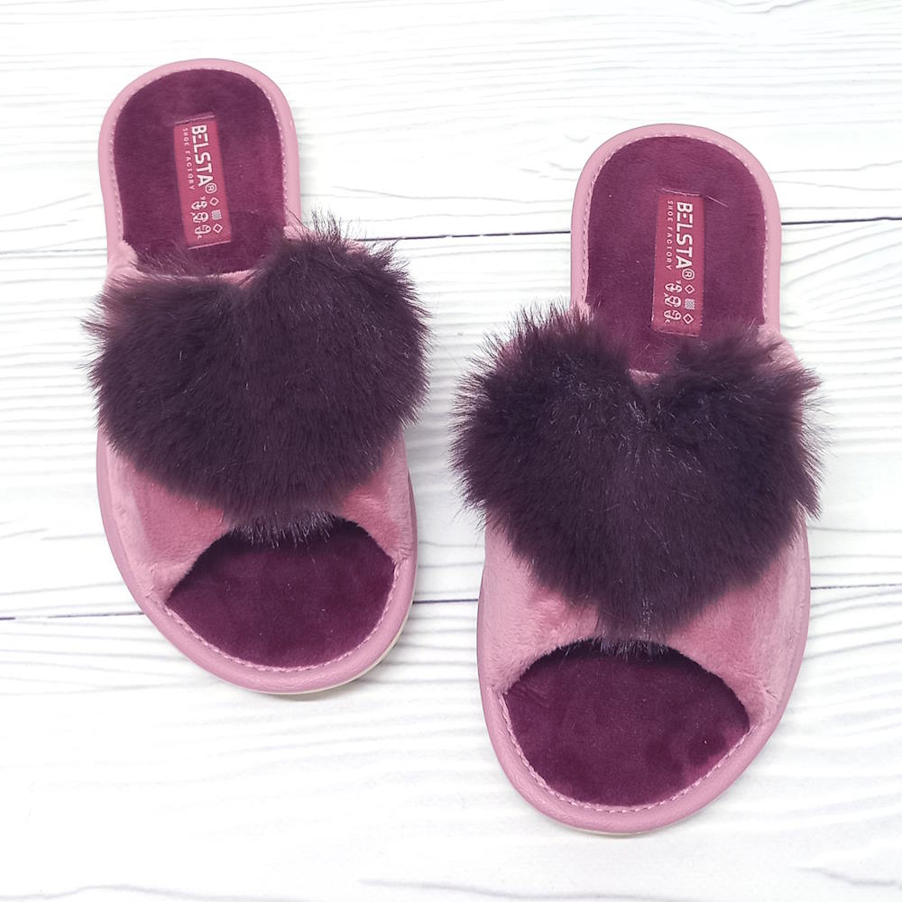 Элегантные тапочки тм Белста, украшение: мех в виде сердца, мягкая бордовая стелька. Подошва износостойкая из полиуретана.