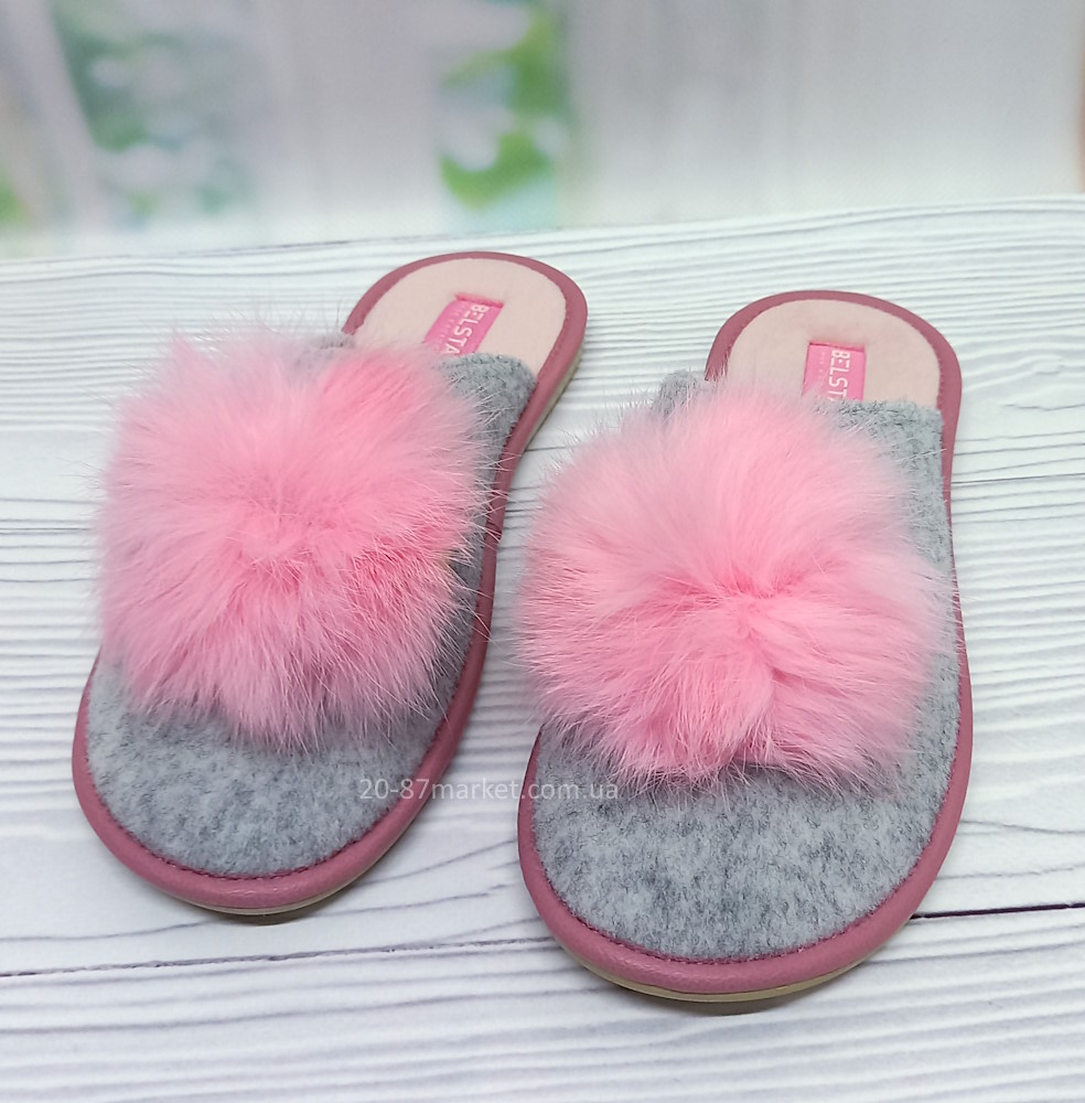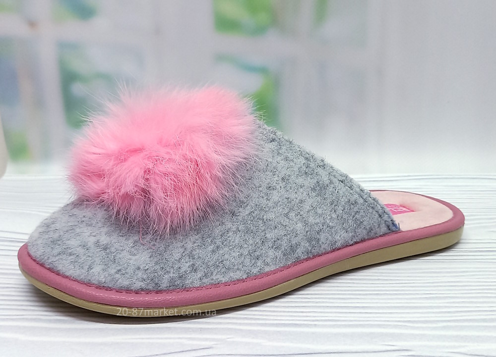 Женские тапочки тм Белста, войлочный верх тапочек украшен натуральным розовым мехом, стелька мягкая, велюровая. Подошва износостойкая из полиуретана, высота 1см.