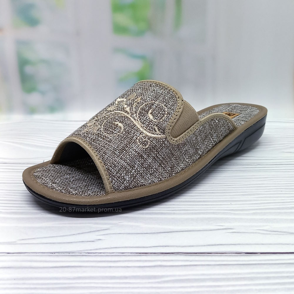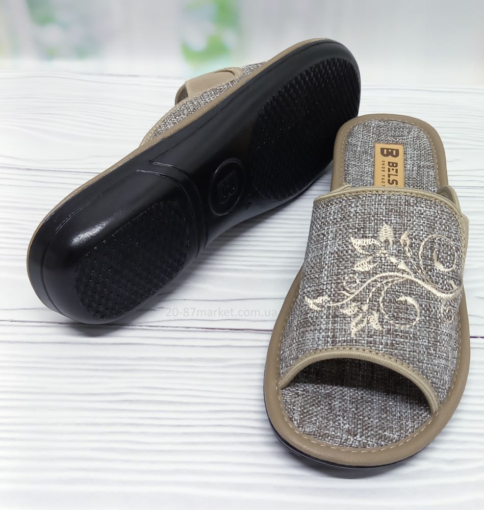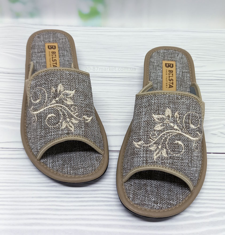 Женские тапочки тм Белста, открытый носок, бежевого цвета, украшены вышивкой, подошва полиуретановая, износостойкая, высота пятки 2см.