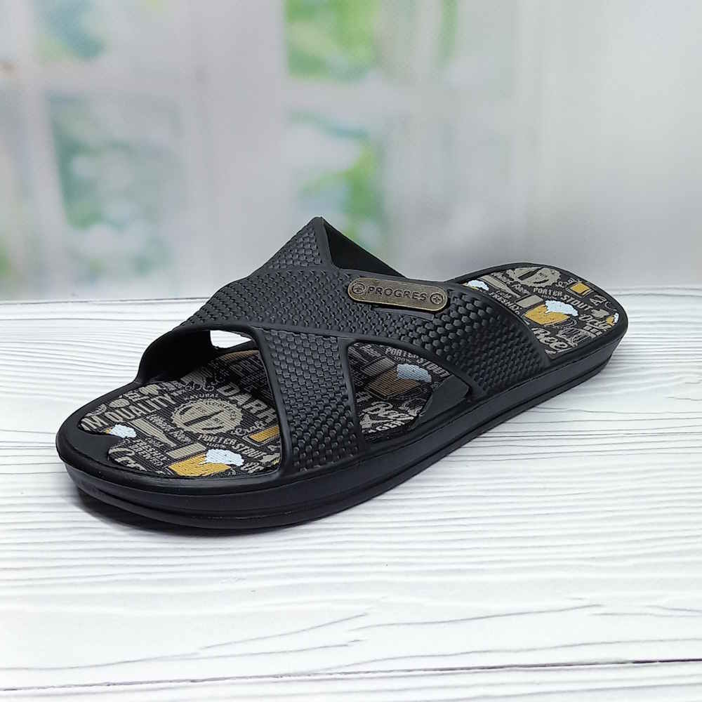 Мужские шлёпанцы ТМ Progress — удобная и практичная обувь для повседневного ношения. Выполнены в чёрном цвете из лёгкого и прочного материала ЭВА, который не впитывает влагу, легко моется и быстро сохнет. Мягкая структура обеспечивает комфорт при ходьбе, а лаконичный дизайн делает модель универсальной — подходят для дома, пляжа и бассейна.