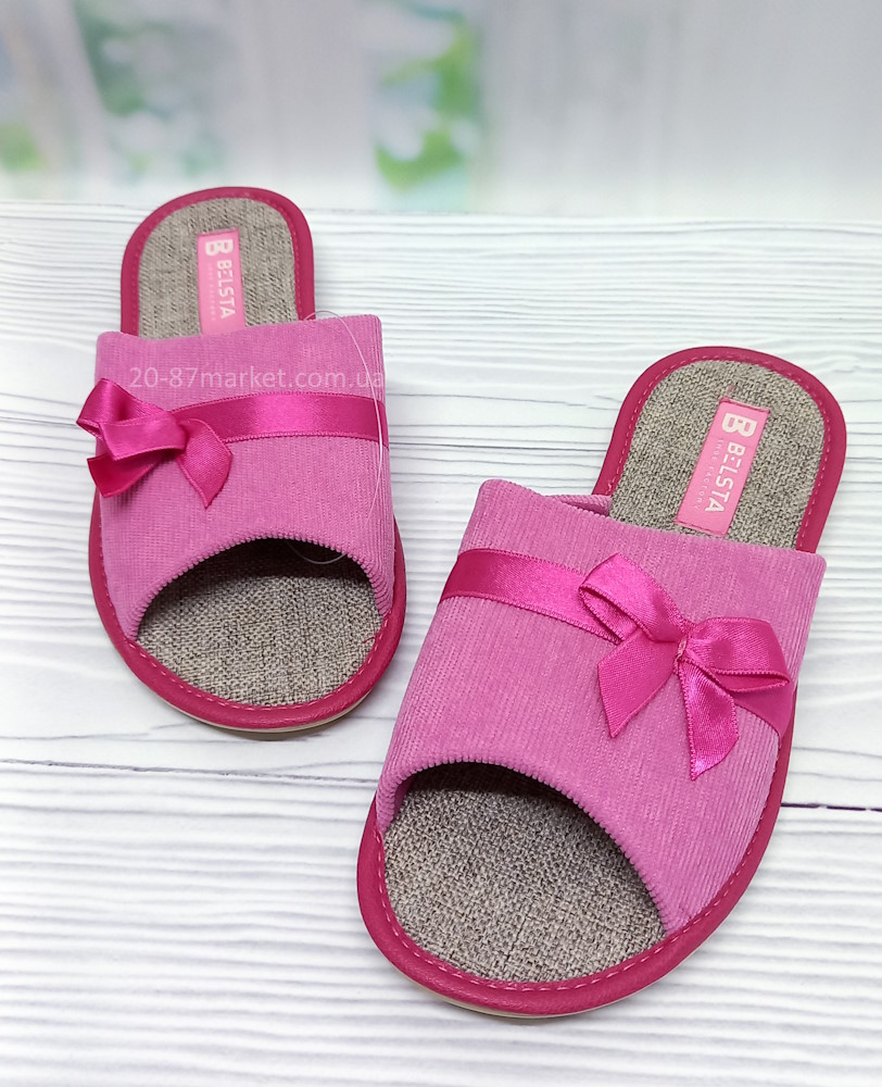 Вельветовые женские тапочки тм Белста, украшены атласным бантиком. Подошва износостойкая из полиуретана, стелька текстильная. Высота подошвы 1см.