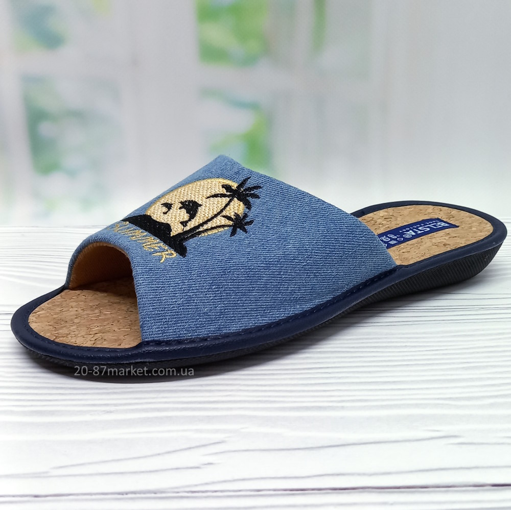 Стильные женские тапочки Белста, открытый носок, вышивка: Остров пальмы, дельфины на фоне солнца, пробковая стелька. Подошва износостойкая из полиуретана. Высота пятки 2 см.