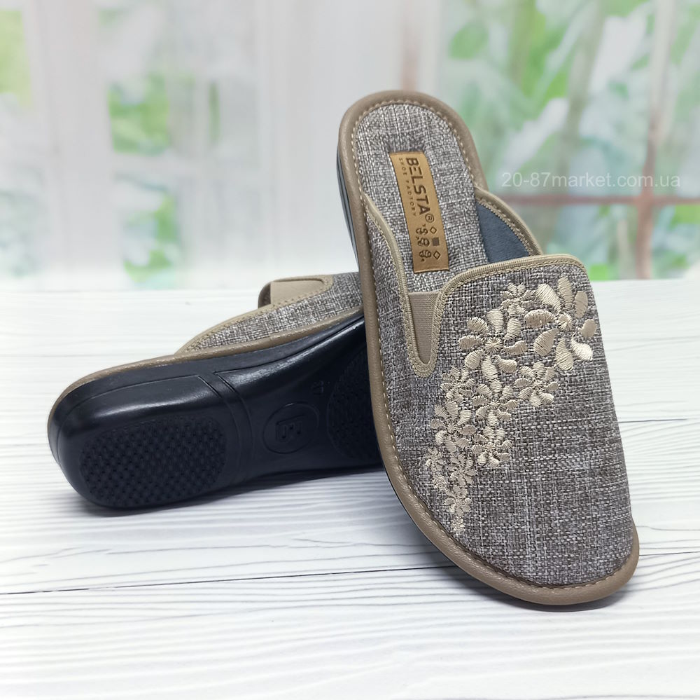 Женские текстильные тапочки. Закрытый верх текстильных тапочек хорошо пропускает воздух что позволяет ногам дышать. Стелька из текстиля. Подошва иносостойкая из полиуретана. ТМ Белста это высокое качество, надежность и комфорт.