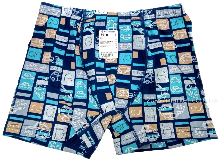 Трусы-боксёрысинего цвета с цветными квадратиками и белой машинкой, для мальчика, от турецкого производителя Baykar, трусы комфортные при носке, сохраняют форму и цвет после стирки.